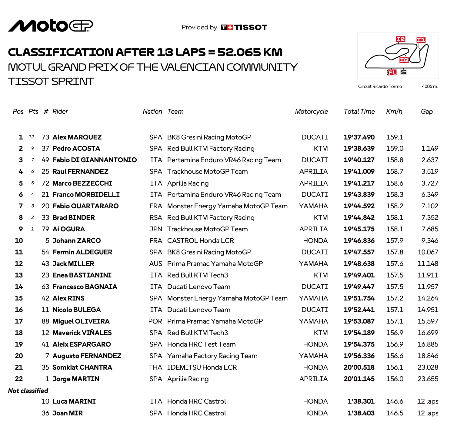 バレンシアのスプリントレースではアレックス・マルケス(グレシーニ・ドゥカティ)が優勝、ペドロ・アコスタ(レッドブルKTM)が2位、ファビオ・ディ・ジャンアントニオ(VR46ドゥカティ)が3位という結果だった。