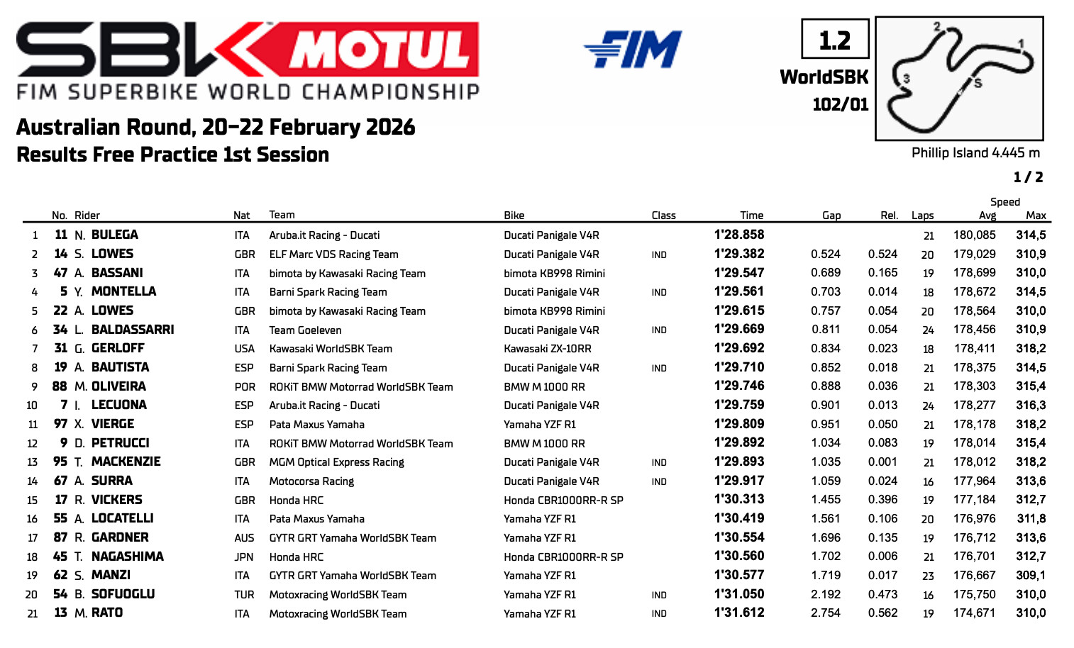ブレガは、週末を理想的な形でスタート。セッション序盤にロングランを敢行し、そのスティント終盤でベストタイムを記録した。オーストラリアでの強さを早々に示し、ライバルに強烈なメッセージを送った。2番手はサム・ロウズ(ELF Marc VDS Racing Team)、3番手はアクセル・バッサーニ(bimota by Kawasaki Racing Team)となった。