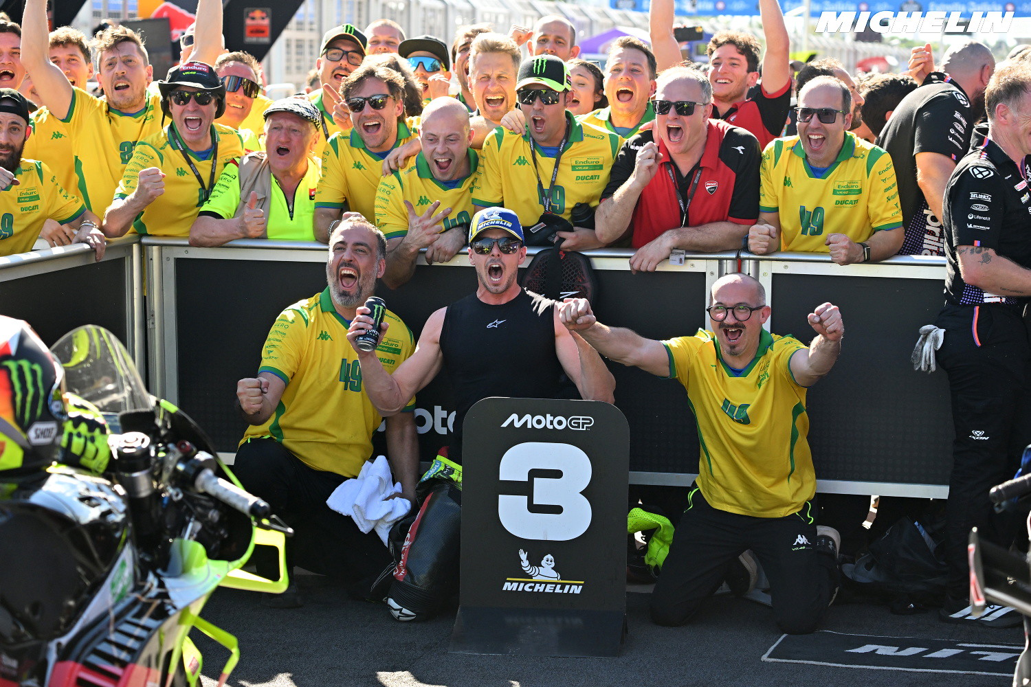 ファビオ・ディ・ジャンアントニオは、決勝3位という結果でチームの努力に応える形となった週末を高く評価した。今朝の転倒でマシンを損傷しながらも修復を施したチームに感謝を示し、自身もブレーキング時の痛みに苦しみながらレースを戦い抜いた。序盤は影響を受けつつも次第にリズムを取り戻し、マルクに対して狙い通りのオーバーテイクを成功させるなど力強い走りを披露。アプリリア勢の安定したコーナリング性能に課題を認識しつつも、マルクとの激しいバトルを制したことで手応えを掴み、トップ争いへの本格参戦に向けて確かな一歩を刻んだ。