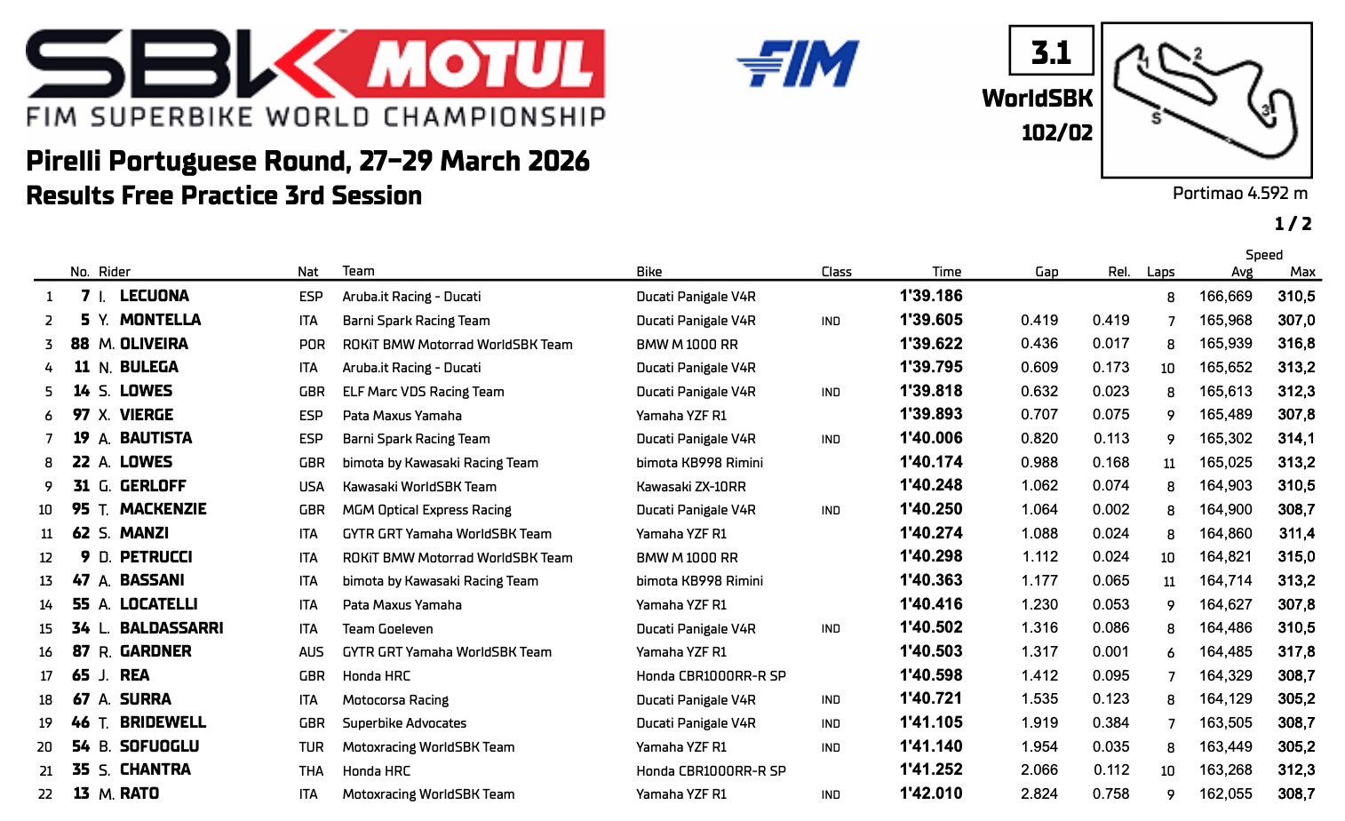 レクオナは金曜から速さを見せていたが、土曜朝の20分間セッションでもその勢いを維持した。2番手にはヤリ・モンテッラ(Barni Spark Racing Team)が入り、トップとの差は0.419秒。3番手には地元ポルトガルのミゲル・オリベイラ(ROKiT BMW Motorrad WorldSBK Team)が続いた。オリベイラはセッション終盤、ターン5のヘアピンでややワイドになった後にロウサイドで転倒したが、それでも1分39秒622を記録してトップ3を確保した。