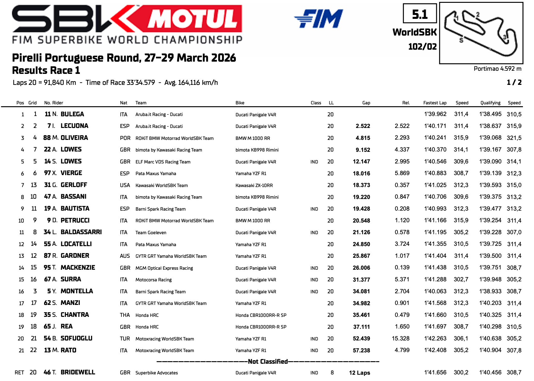 ニコロ・ブレガ(Aruba.it Racing – Ducati)がポルティマオで行われたレース1を制し、連勝記録を8に伸ばした。チームメイトのイケル・レクオナが2位に入り、ドゥカティがワンツーフィニッシュ。3位には地元ポルトガルのミゲル・オリベイラ(ROKiT BMW Motorrad WorldSBK Team)が入り、WorldSBK初表彰台を達成した。