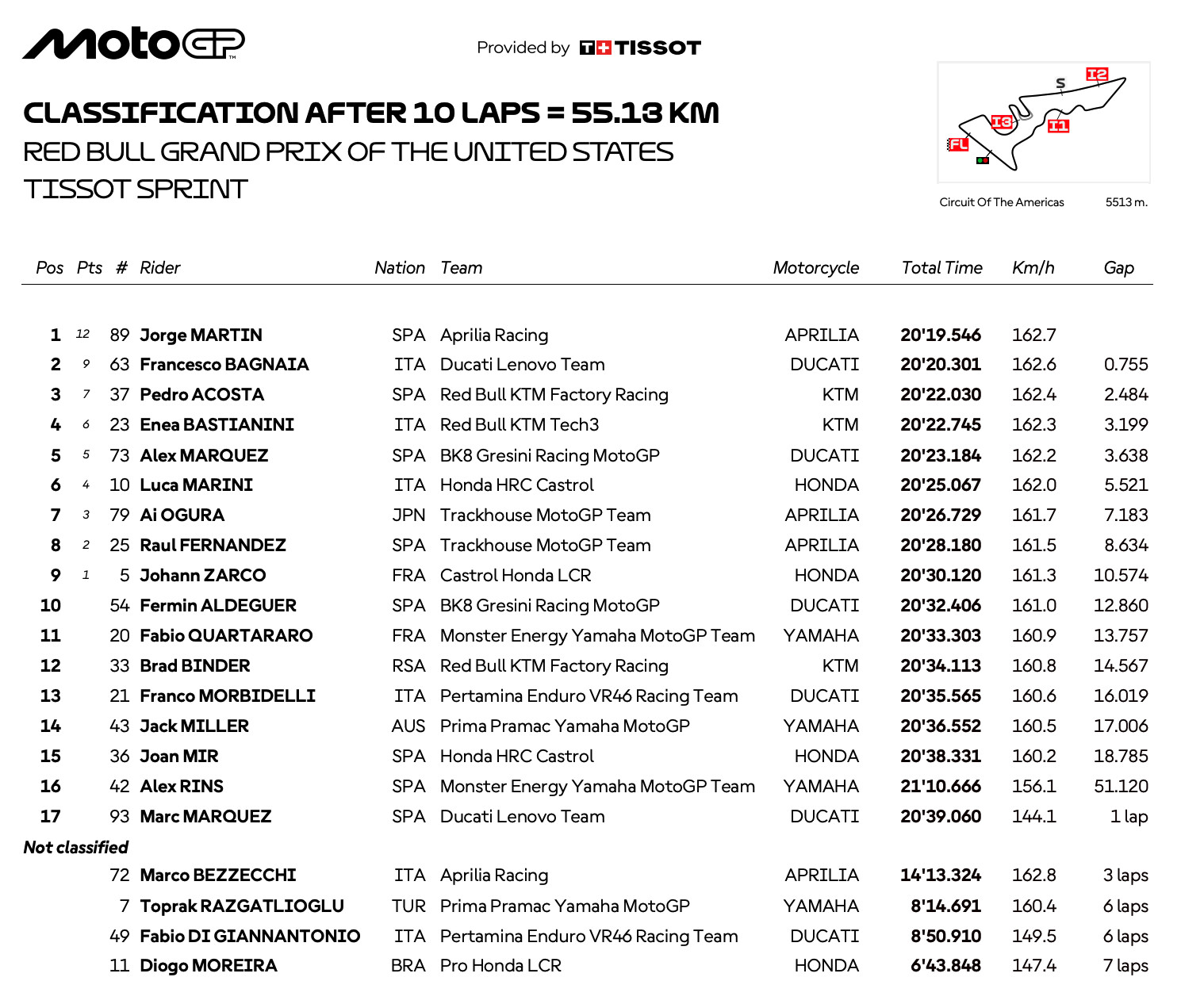 ホルヘ・マルティン(アプリリア・レーシング)が、テキサスで行われたスプリントレースで劇的な逆転勝利を飾った。終盤まで首位を走っていたフランチェスコ・バニャイア(ドゥカティ・レノボ・チーム)を最終ラップで攻略し、0.7秒差をつけてフィニッシュ。2024年以来、そしてアプリリア移籍後初となるスプリント優勝を挙げた。なお、マルティンはチェッカー後にウイリーをして着地時に転倒したが、ライダーに問題はなかった。