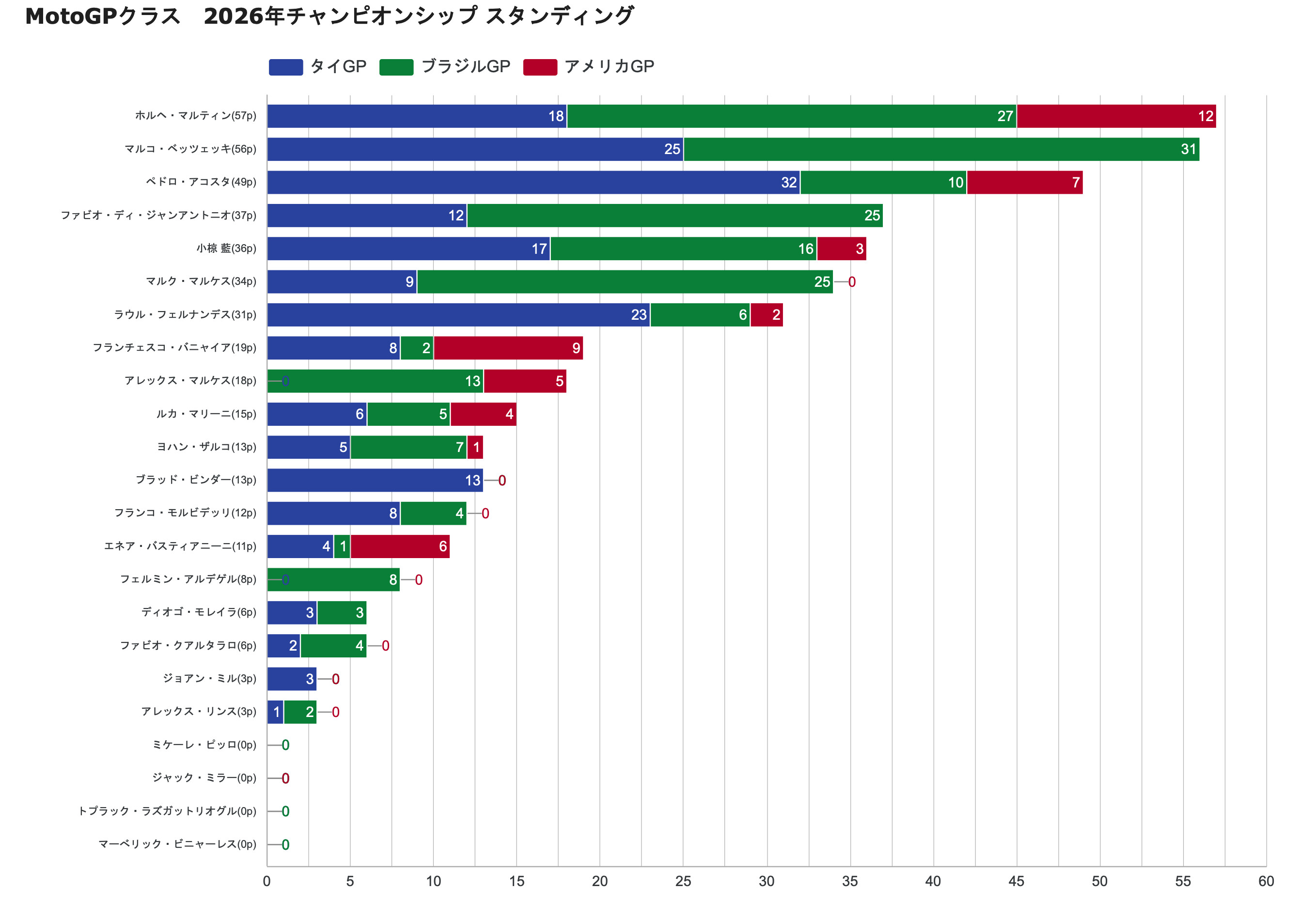 最終ラップ、マルティンが一気にギャップを詰め、ターン12で決定的なオーバーテイクを敢行。バニャイアを抑え込み、そのままトップチェッカーを受けた。この勝利により、マルティンはランキング首位に浮上した。
