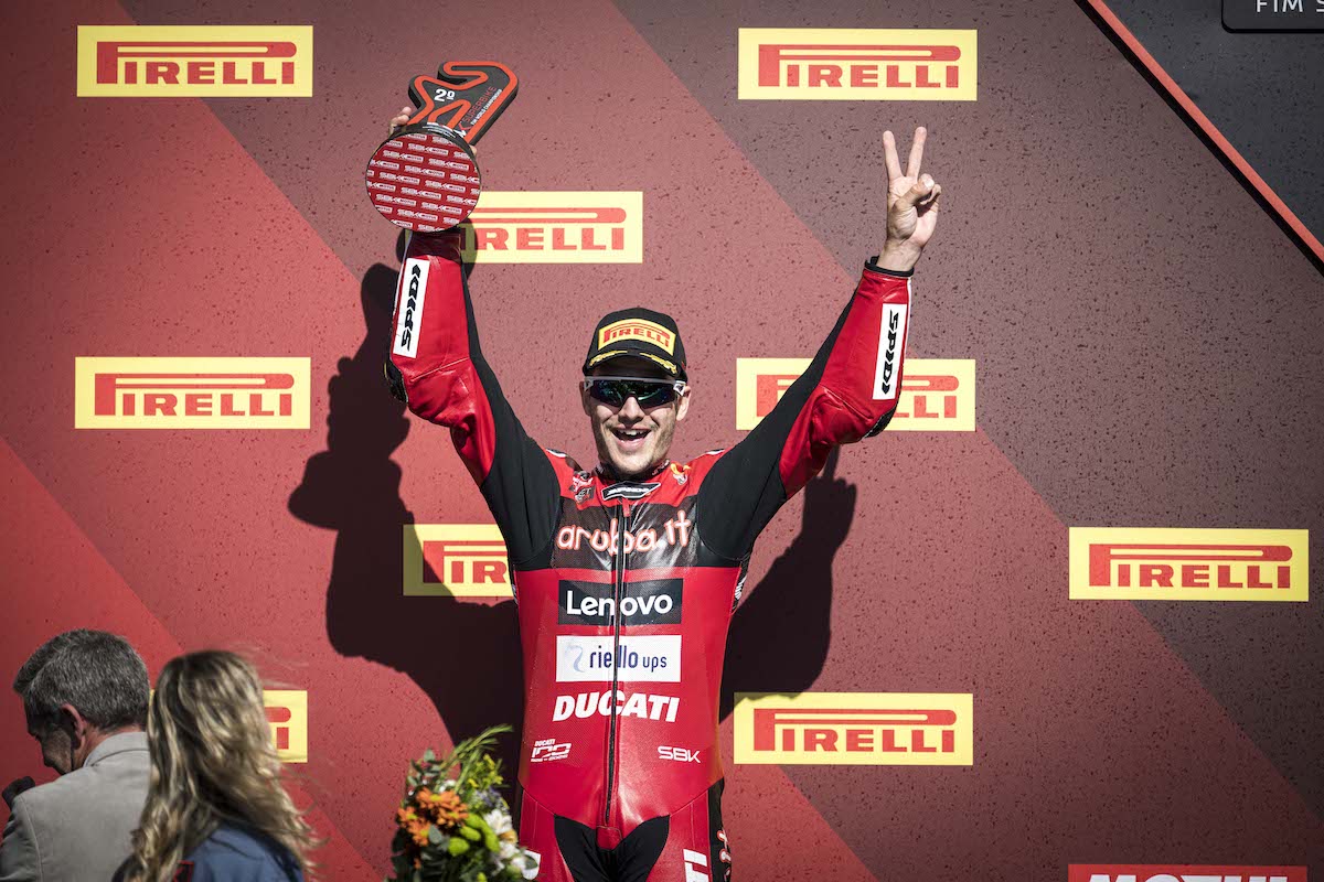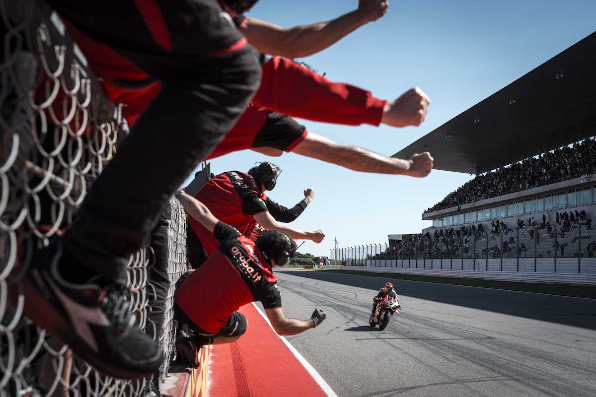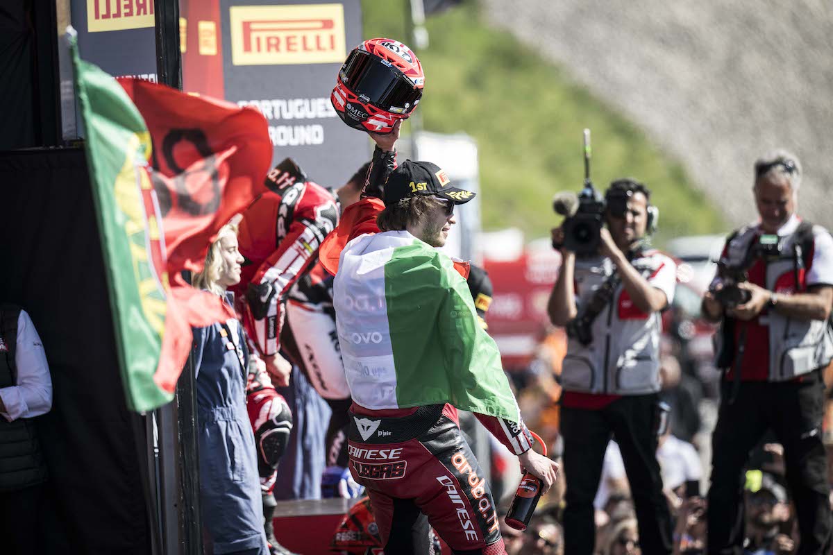 Aruba.it Racing – Ducatiがポルティマオで歴史的快挙を達成した。ニコロ・ブレガが3連勝、イケル・レクオナが3戦すべてで2位に入り、同一チームが3レースすべてで1-2フィニッシュを達成するという前例のない記録を打ち立てた。土曜日のスーパーポールとレース1に続き、日曜日のスーパーポールレースとレース2でも両者が1-2を独占。完璧な週末でドゥカティの強さを証明した。この結果、ブレガは124ポイントでランキング首位、レクオナも68ポイントで2位に浮上。チームランキングおよびマニュファクチャラーズランキングでも暫定首位に立った。