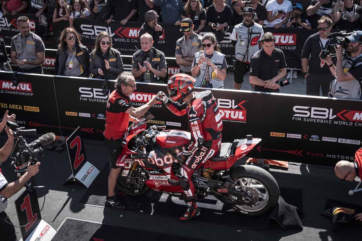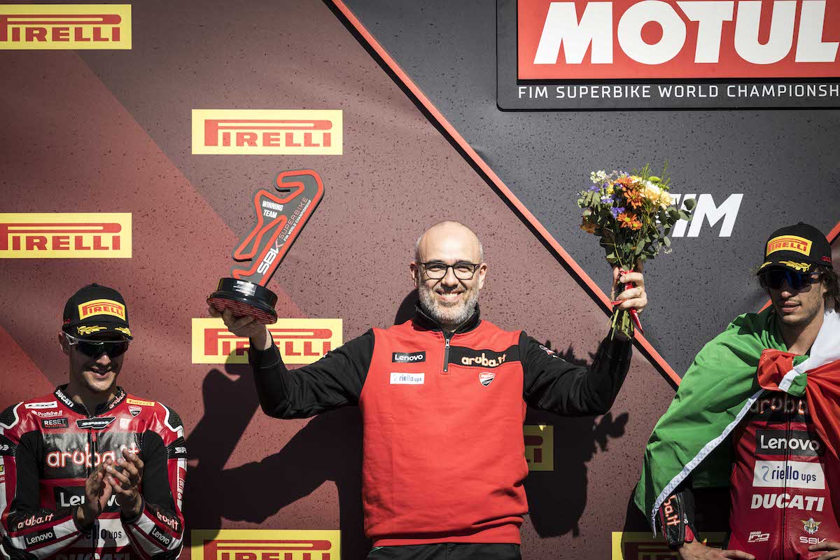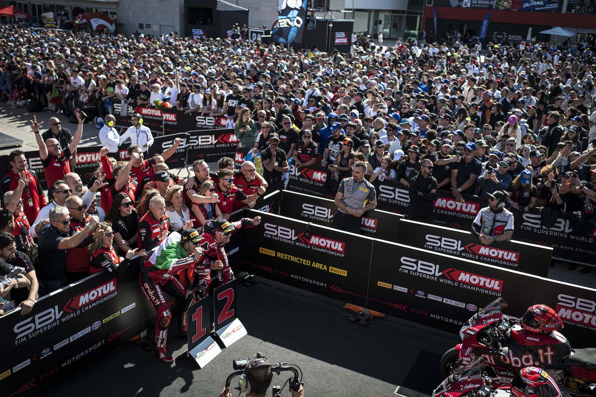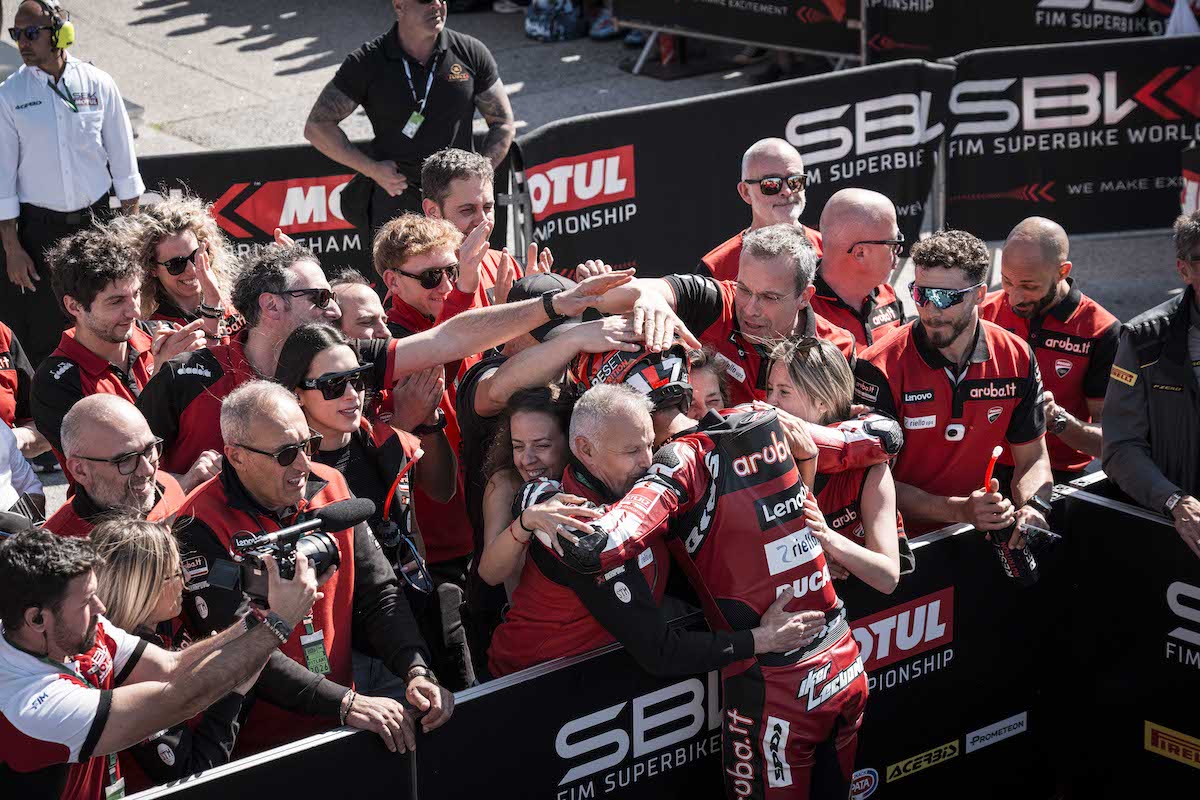 Aruba.it Racing – Ducatiがポルティマオで歴史的快挙を達成した。ニコロ・ブレガが3連勝、イケル・レクオナが3戦すべてで2位に入り、同一チームが3レースすべてで1-2フィニッシュを達成するという前例のない記録を打ち立てた。土曜日のスーパーポールとレース1に続き、日曜日のスーパーポールレースとレース2でも両者が1-2を独占。完璧な週末でドゥカティの強さを証明した。この結果、ブレガは124ポイントでランキング首位、レクオナも68ポイントで2位に浮上。チームランキングおよびマニュファクチャラーズランキングでも暫定首位に立った。