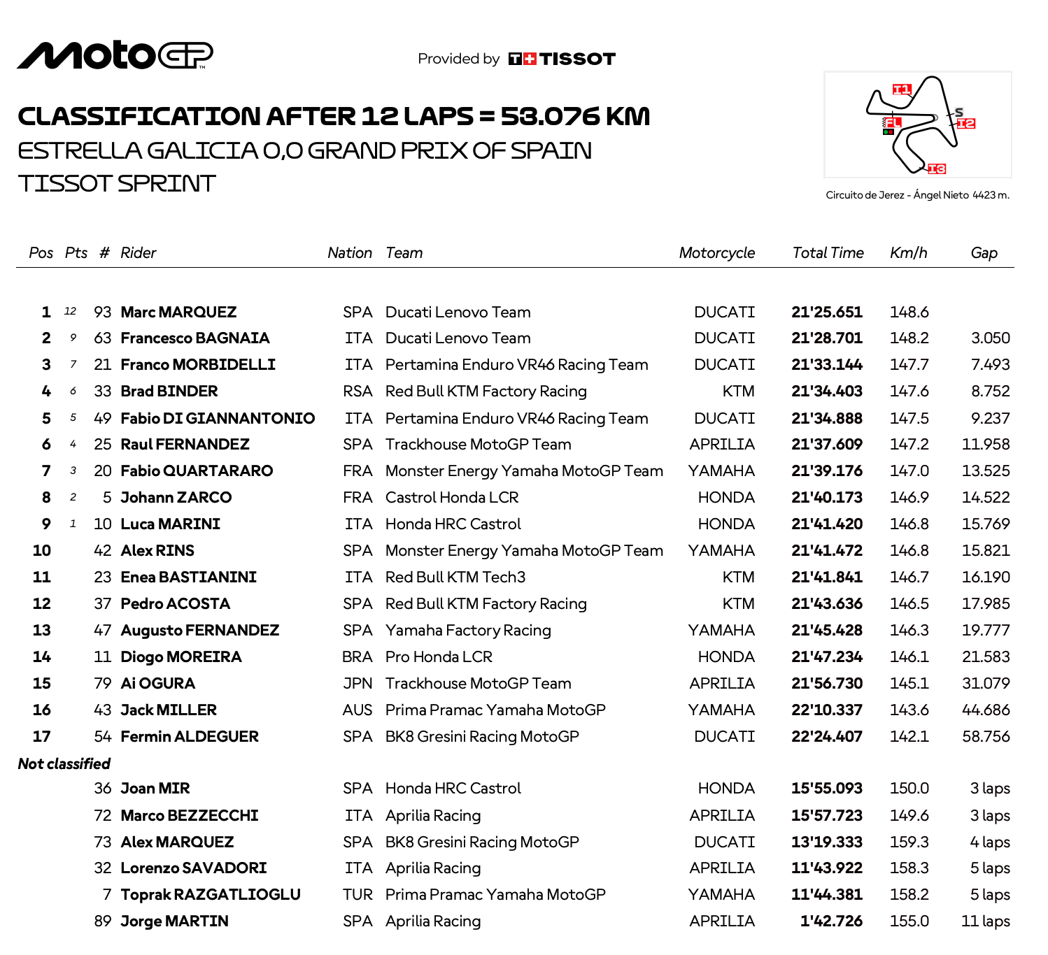 レース終盤、バニャイアをかわしたマルク・マルケスが再びトップに立つ。トップから転倒、17番手まで後退しながらも再び先頭へ返り咲く驚異的な展開で、そのままチェッカーを受けた。2位のバニャイアは連続でスプリント表彰台を獲得。さらに、早めのピットインを行ったモルビデリが3位に食い込み、波乱のレースを締めくくった。