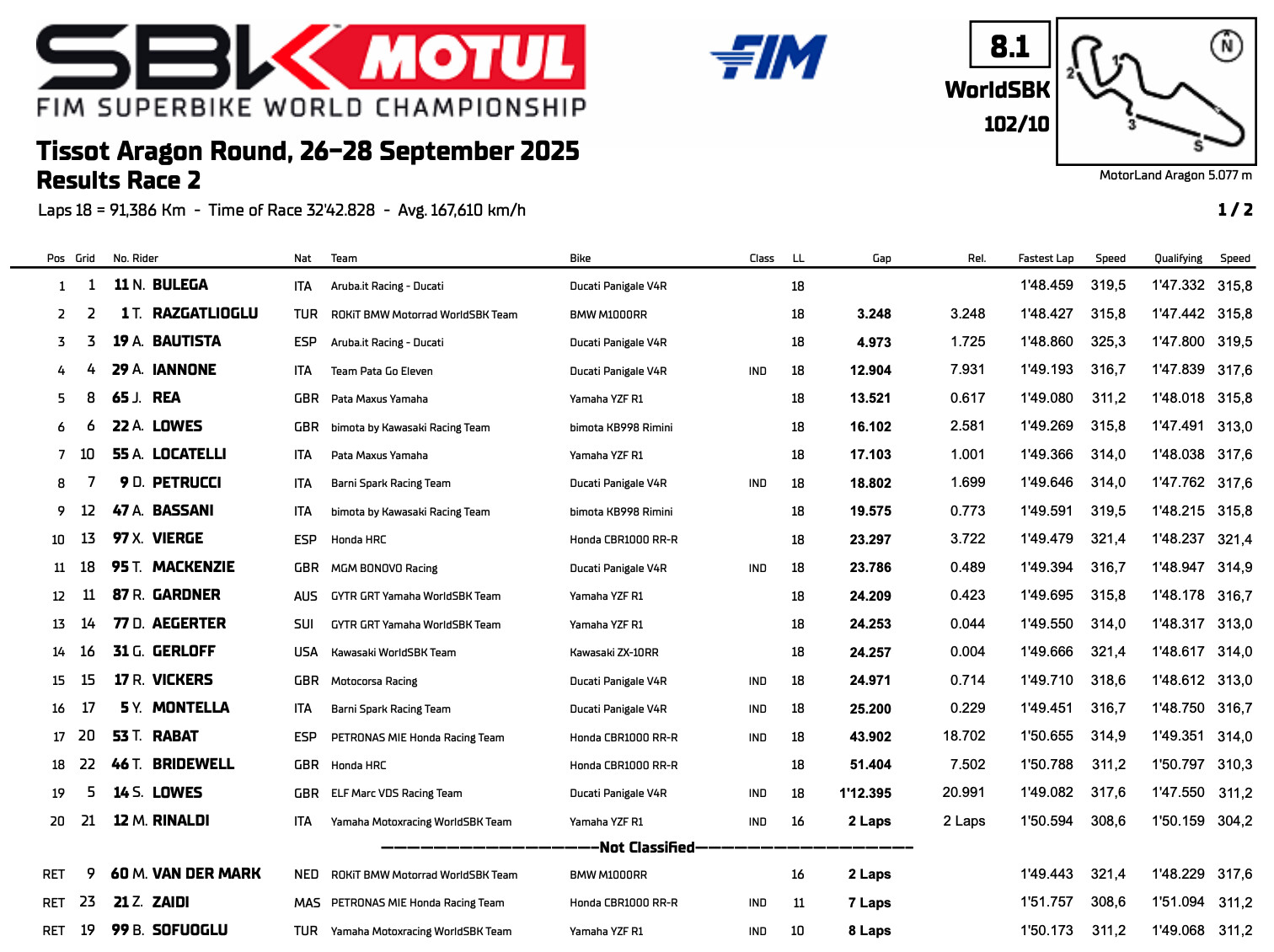 ニコロ・ブレガ(Aruba.it レーシング – ドゥカティ)がアラゴンで日曜2連勝を飾り、トプラック・ラズガットリオグル(ROKiT BMW モトラッドWorldSBKチーム)との激戦を再び制した。ラウンドを通じて3度目の直接対決は、巧みなディフェンスから抜け出したブレガが主導権を握り、終盤にかけて独走。ラズガットリオグルの追撃を封じ、今季10勝目を挙げた。