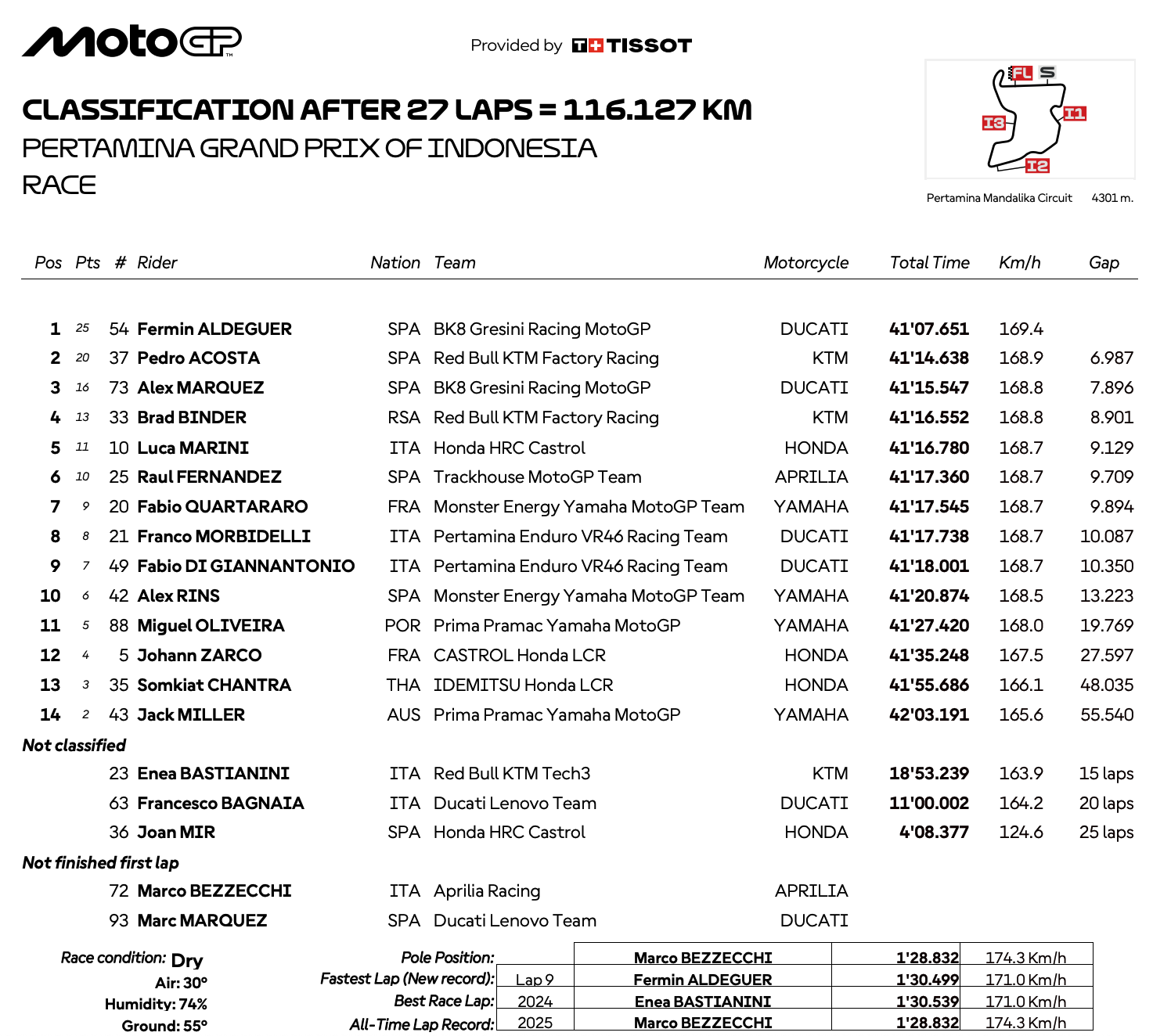 フェルミン・アルデゲル(BK8グレシーニ・レーシングMotoGP)がインドネシアGPで劇的な初勝利を挙げ、MotoGP史上2番目の若さでの優勝者となった。1周目でマルコ・ベッツェッキ(アプリリア・レーシング)とマルク・マルケス(ドゥカティ・レノボ・チーム)が接触・転倒する波乱の幕開けとなった決勝レースで、アルデゲルは序盤からリードを築き、圧倒的な速さで独走態勢に持ち込んだ。ペドロ・アコスタ(レッドブルKTMファクトリー・レーシング)が2位に入り、アレックス・マルケス(BK8グレシーニ・レーシングMotoGP)が3位表彰台を獲得した。