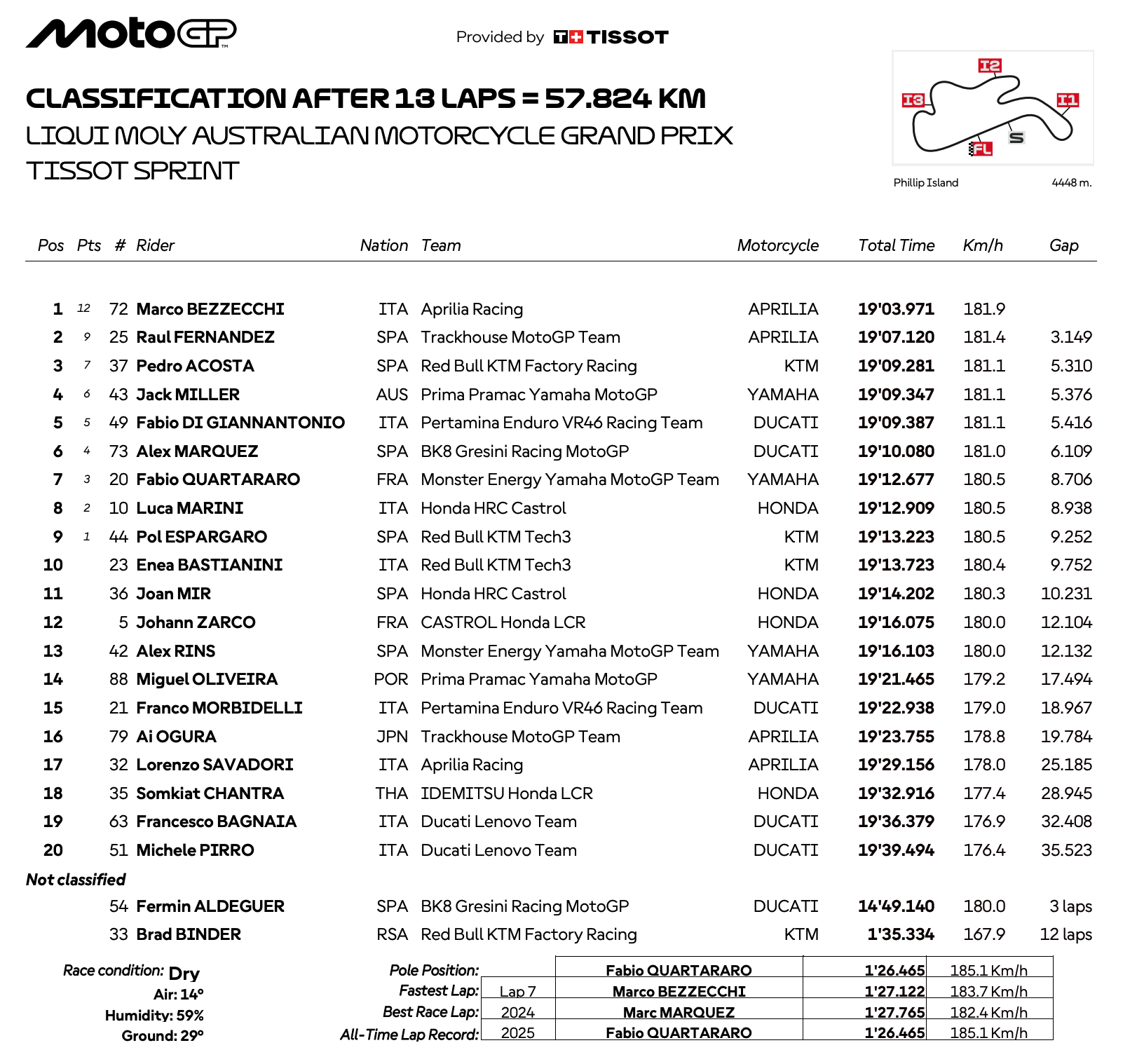 3位はジャック・ミラーとアレックス・マルケスを抑えきったアコスタが入った。4位のジャック・ミラーは地元オーストラリアで最上位のヤマハライダーとしてフィニッシュした。5位は4位争いに終盤参加したファビオ・ディ・ジャンアントニオ、6位アレックス・マルケス、7位ファビオ・クアルタラロ、8位ルカ・マリーニ、9位はKTMテストライダーのポル・エスパルガロとなった。