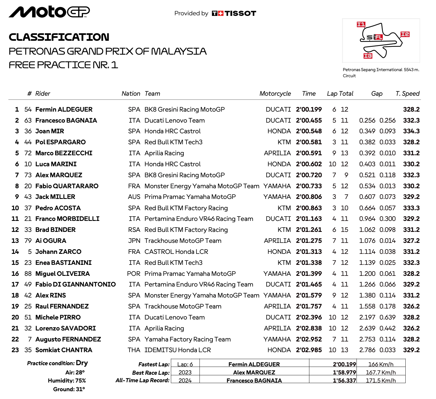 セッション終盤には再び数名のライダーがウェットコンディションの中でコースイン。クアルタラロとオーストラリアGP優勝者のラウル・フェルナンデス(トラックハウスMotoGPチーム)はターン12で大きくバランスを崩す場面があった。また、エスパルガロもターン9でフロントが乱れるシーンがあったが、全ライダーが転倒なく走行を終えた。不安定な天候が予想されるセパンでの週末、初日の走行は、刻々と変化するコンディションへの適応力が鍵となることを示したセッションとなった。