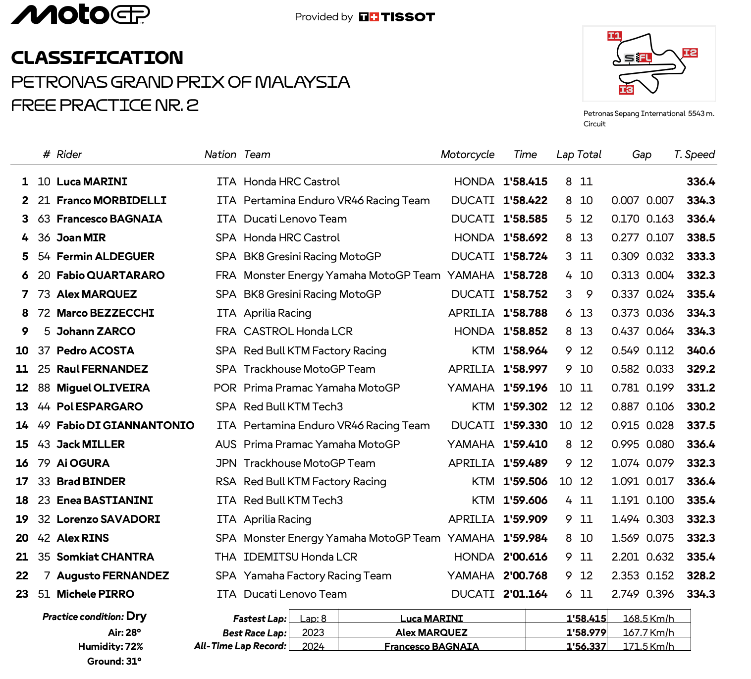 マレーシアGPのフリープラクティス2(FP2)は、ルカ・マリーニ(Honda HRC Castrol)がトップタイムを記録した。2位にはフランコ・モルビデッリ(Pertamina Enduro VR46 Racing Team)、3位にフランチェスコ・バニャイア(Ducati Lenovo Team)が続いた。