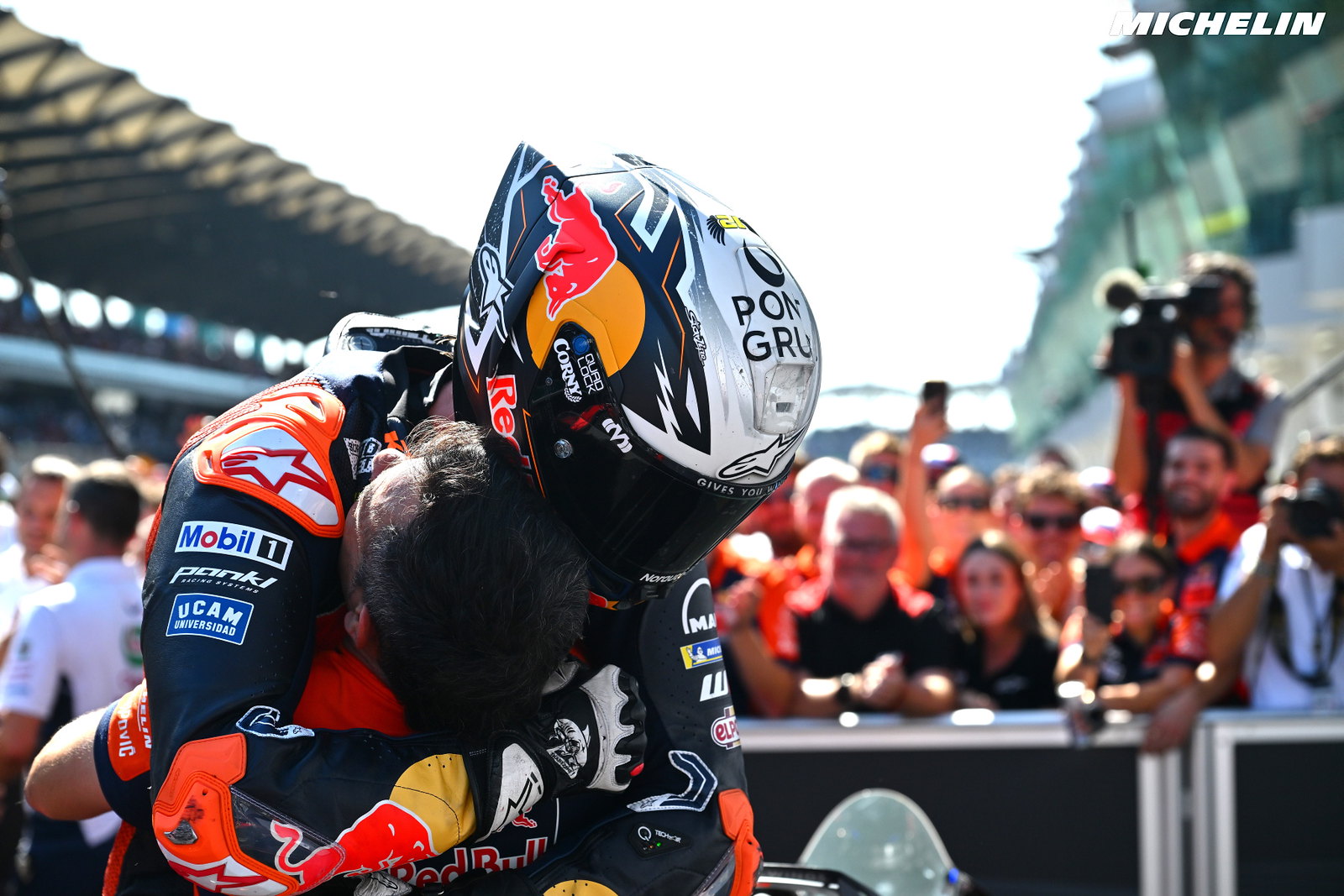 ペドロ・アコスタはウォームアップではバイクに望まぬ変化が生じたが、それでも冷静に対応し、改善を重ねてレースに臨んだ。スタートからトップに立つ意志を持っていたが、ペッコの“ロケット”のような加速に圧倒され、その後はアレックスのアグレッシブなペースにも翻弄される展開に。タイヤの摩耗を序盤から恐れていたこともあり、すぐには勝負を仕掛けず、フロントの挙動を見極めながら自分のタイミングを待つ戦略を選んだ。ペッコとのクリーンなバトルを楽しみつつ、ジョアンとのギャップを確実にコントロール。最終的には、自らの位置を受け入れ、2位を守る走りに徹した。