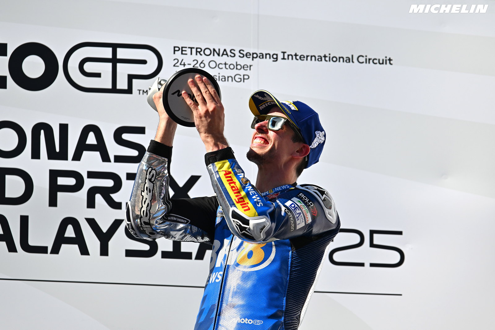 アレックス・マルケスは、前日の反省を活かして序盤からアグレッシブに前へ出る明確な戦略でマレーシアGPに臨んだ。アコスタとバニャイアをかわしてからは自分のリズムで安定した走行を続け、タイヤの摩耗を巧みにコントロール。まるでレースシミュレーションのように単独で周回を重ね、完璧な形で勝利を手にした。チームの準備も万全で、シーズンを通しての成長と成果を象徴する一戦となった。兄のマルクにランキング1位を譲った今季、ランキング2位と独立チーム最上位の座を確保したことで、自らの価値をしっかりと証明した。