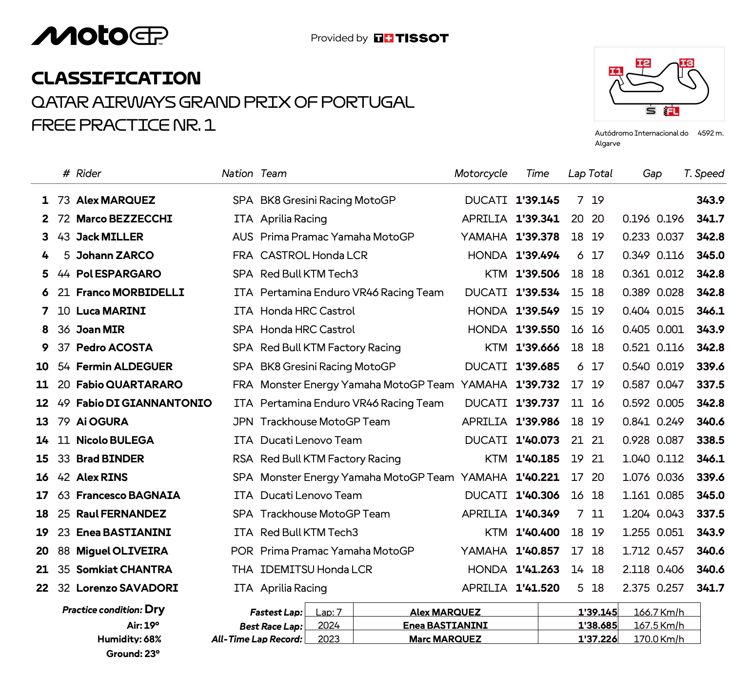 2025年シーズン最終盤、アレックス・マルケス(BK8グレシーニ・レーシングMotoGP)がポルティマオでのフリー走行1回目(FP1)を制して、自己最高のシーズンを締めくくる準備を万全に整えた。空模様は不安定ながらも、セッション中はドライコンディションを維持。アルガルヴェの丘に暗雲が立ち込めるなかでも、アレックス・マルケスは終始トップペースを刻み続けた。