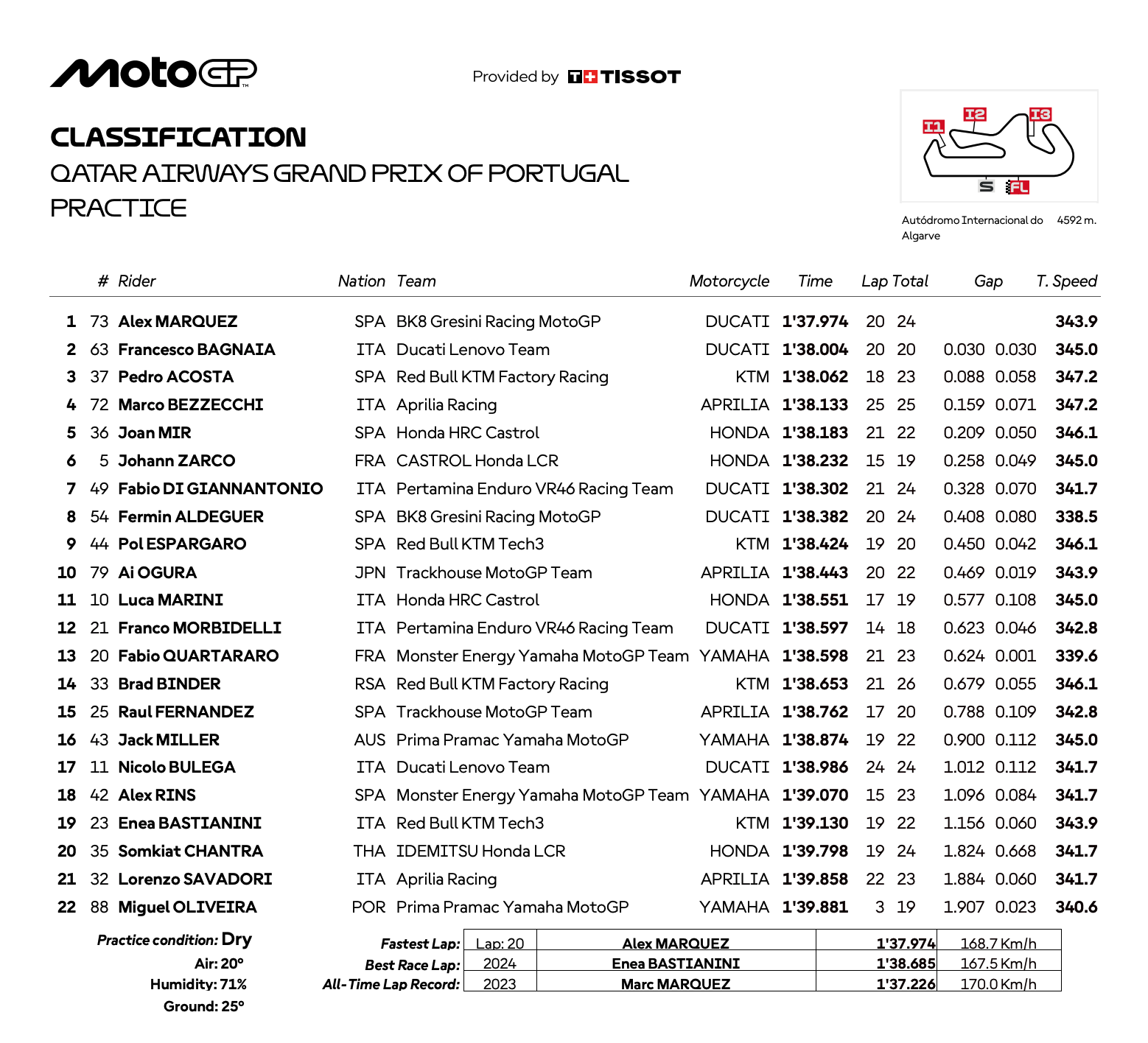 ポルトガル・ポルティマオで開催されている2025年カタール航空ポルトガルGPの初日、アレックス・マルケス(BK8グレシーニ・レーシングMotoGP)が総合トップタイムを記録し、混戦模様の幕を切った。2位のフランチェスコ・バニャイア(ドゥカティ・レノボ・チーム)、3位のペドロ・アコスタ(レッドブルKTMファクトリーレーシング)との差はわずか0.088秒。雨の気配が漂う不安定なコンディションの中で、マルケスが最速の1分37秒974を叩き出し、週末の主導権を握った。