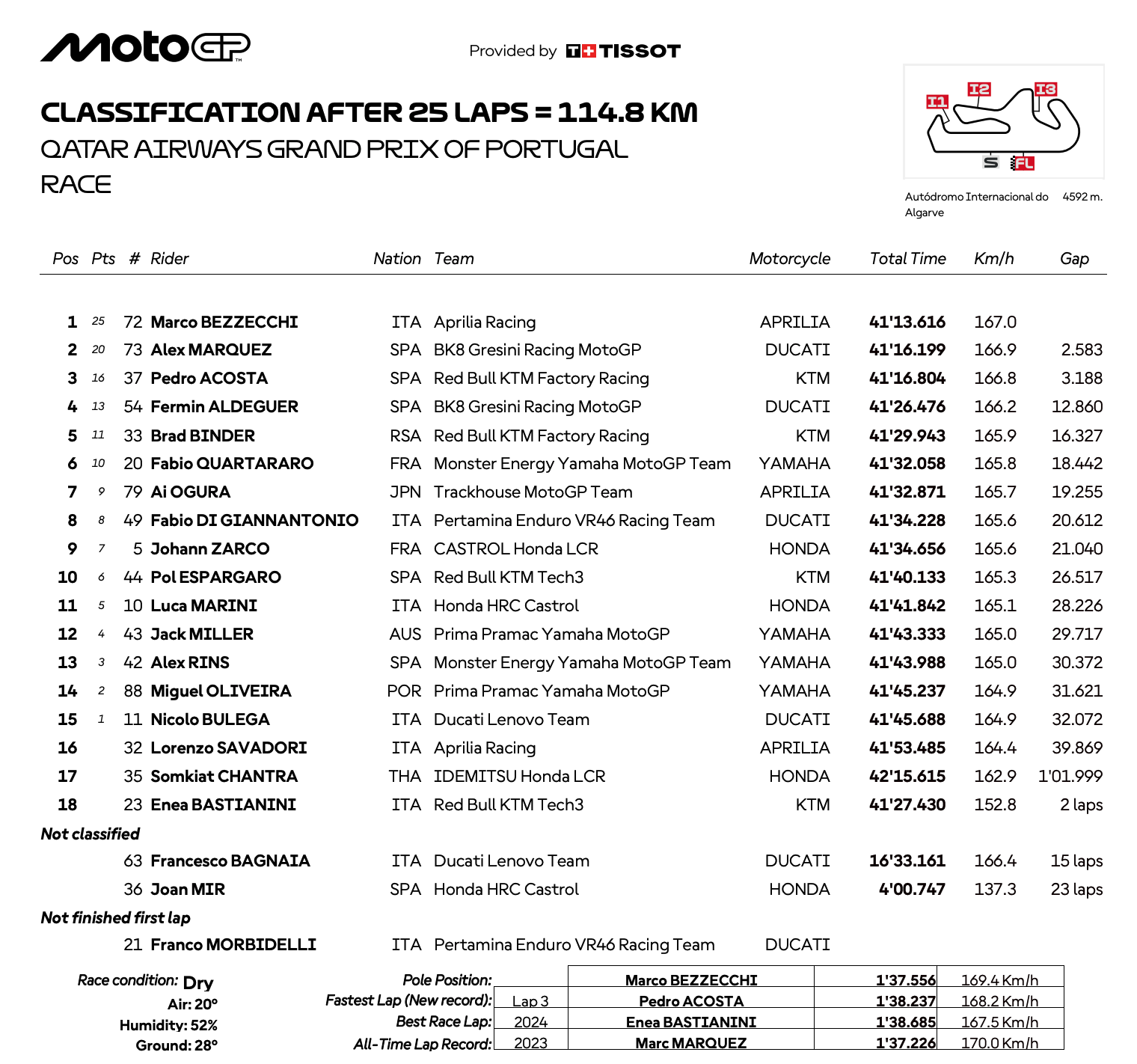 ポルトガルGPの決勝レースでは再びマルコ・ベッツェッキ(アプリリア・レーシング)がポールポジションから抜群のスタートを披露、その後ろにペドロ・アコスタ(レッドブルKTM)、アレックス・マルケス(グレシーニ・ドゥカティ)が続く展開となった。ウォームアップで大幅にペースアップを果たしたマルコ・ベッツェッキ(アプリリア・レーシング)は、スタート後一度も追いつかれることなく圧倒的なペースを最後まで披露して優勝した。