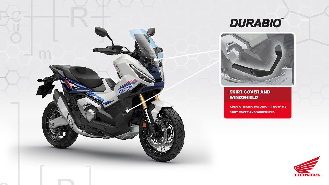 デュラビオ™は、2024年3月発売のCRF1100Lアフリカツインのウインドスクリーンに世界初採用されたのを皮切りに、X-ADVのスカートカバーとウインドスクリーン、フォルツァ750のハンドルバー中央カバーとフロントサイドカウルへと広がった。