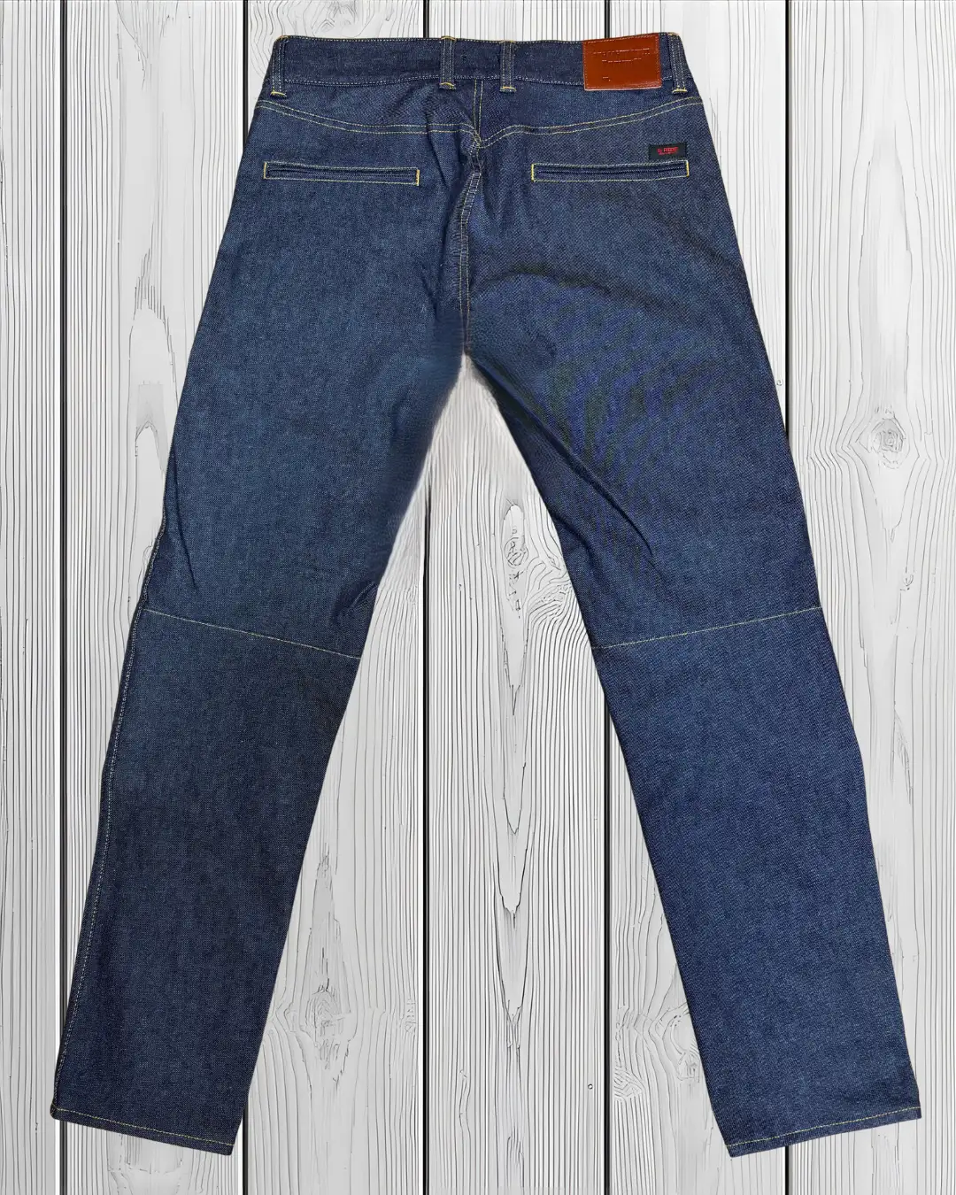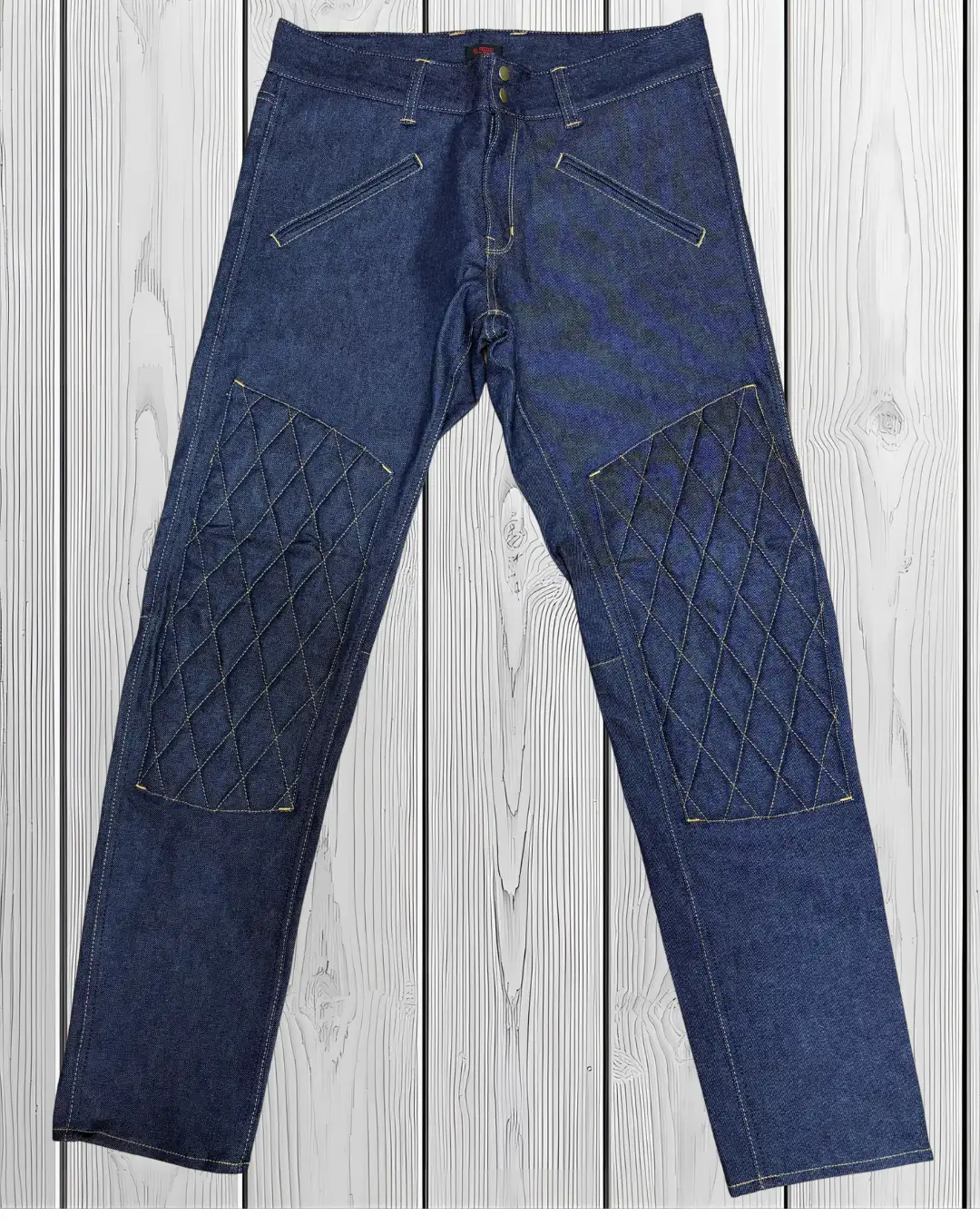 使用する生地は岡山産の12オンスデニム(スパンデックス2%混)。秋田県・宮城県の職人が1本ずつ丁寧に縫製し、純国産品質を追求。O脚のライダーにもフィットする設計、三層構造の膝パッド(10mm厚ウレタン+別布+デニム)により、長時間のライディングでも高い快適性と耐久性を両立させた。