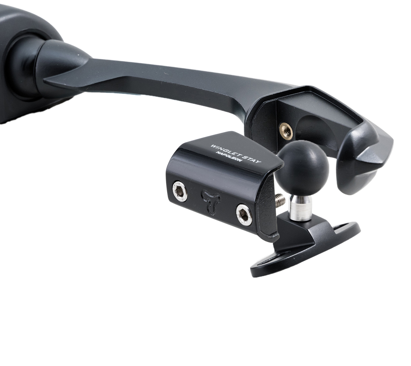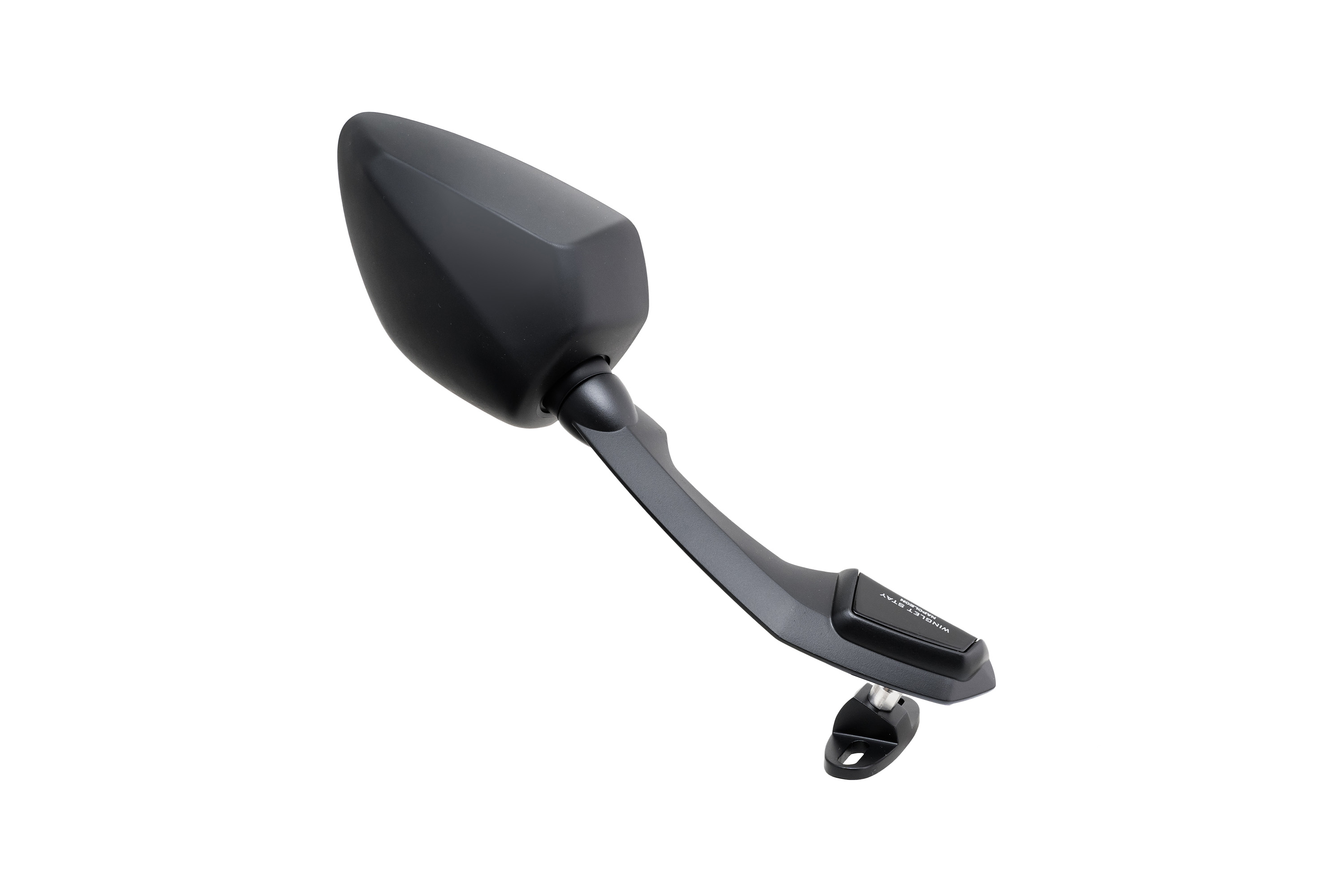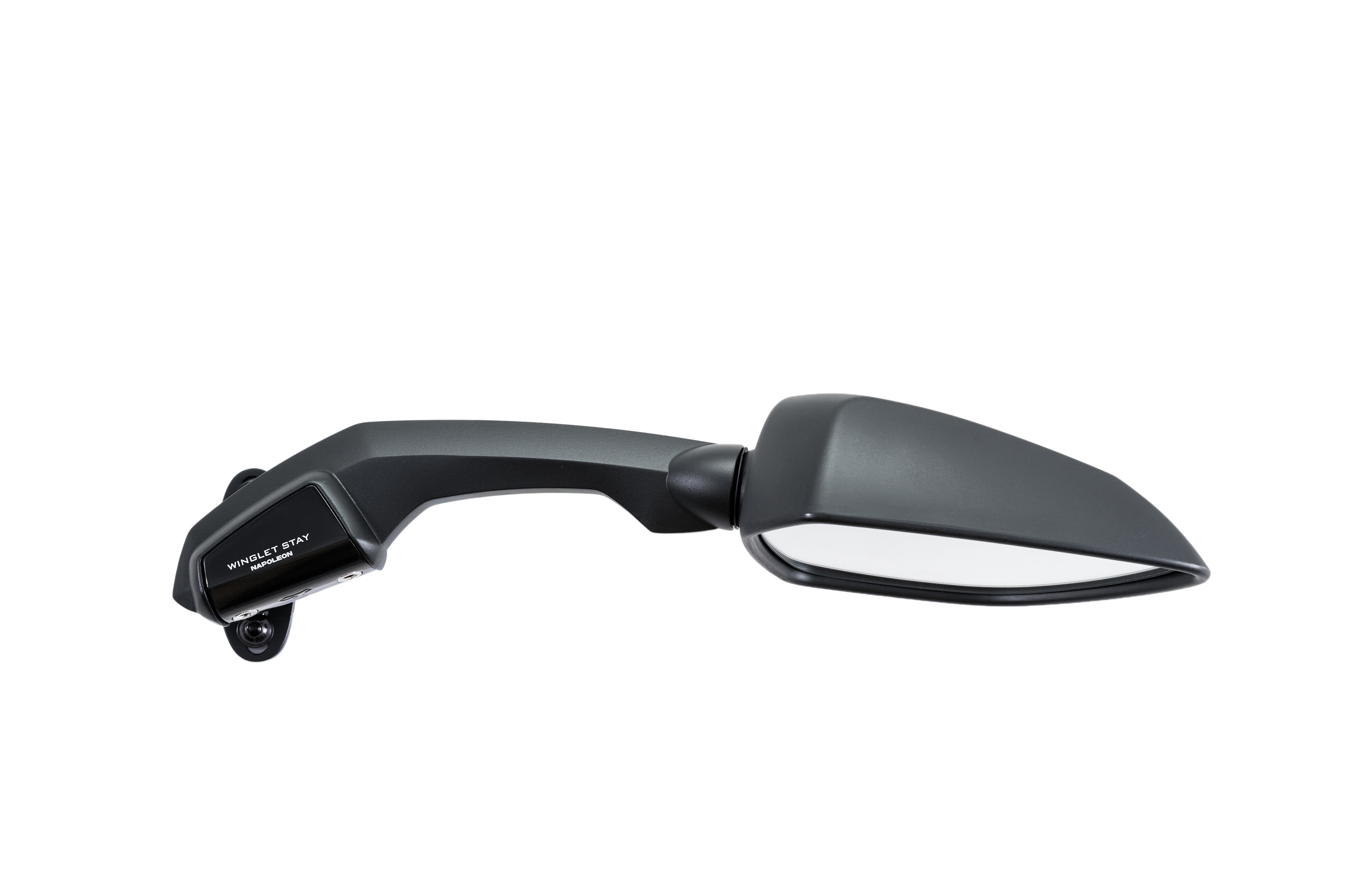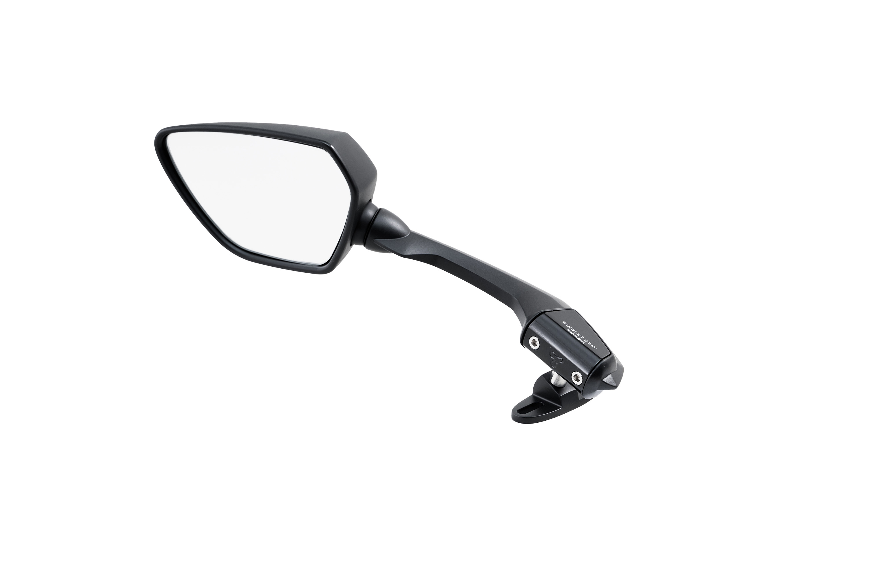 最大の特徴は、ダウンフォース効果をイメージした水平翼モチーフのウイングレットステー。車体デザインと一体化する低く伸びたシルエットにより、スポーティで洗練された印象を演出する。さらにロングステー設計とすることで、前傾姿勢時でも後方視界を確保しやすく、ツーリングからスポーツライディングまで幅広く対応する。