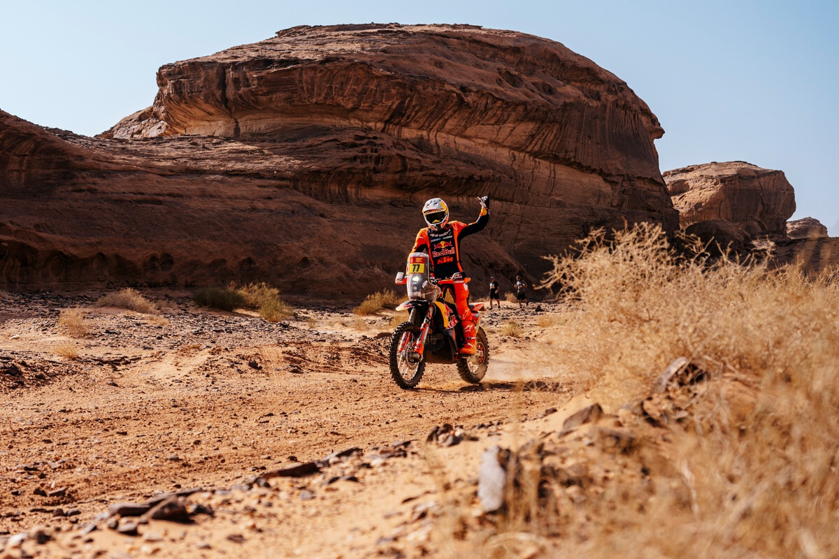 この日のステージは、アルウラからマラソンキャンプへ向かう全長417kmのスペシャルステージ。78kmのリエゾン区間を含む過酷なルートには、砂の峡谷と岩場のスラブ、視認しづらいオフピステ区間が連続。外部からのサポートが認められないマラソンステージならではの条件下で、ライダーたちには冷静な判断とマシンを労る慎重な走りが求められた。