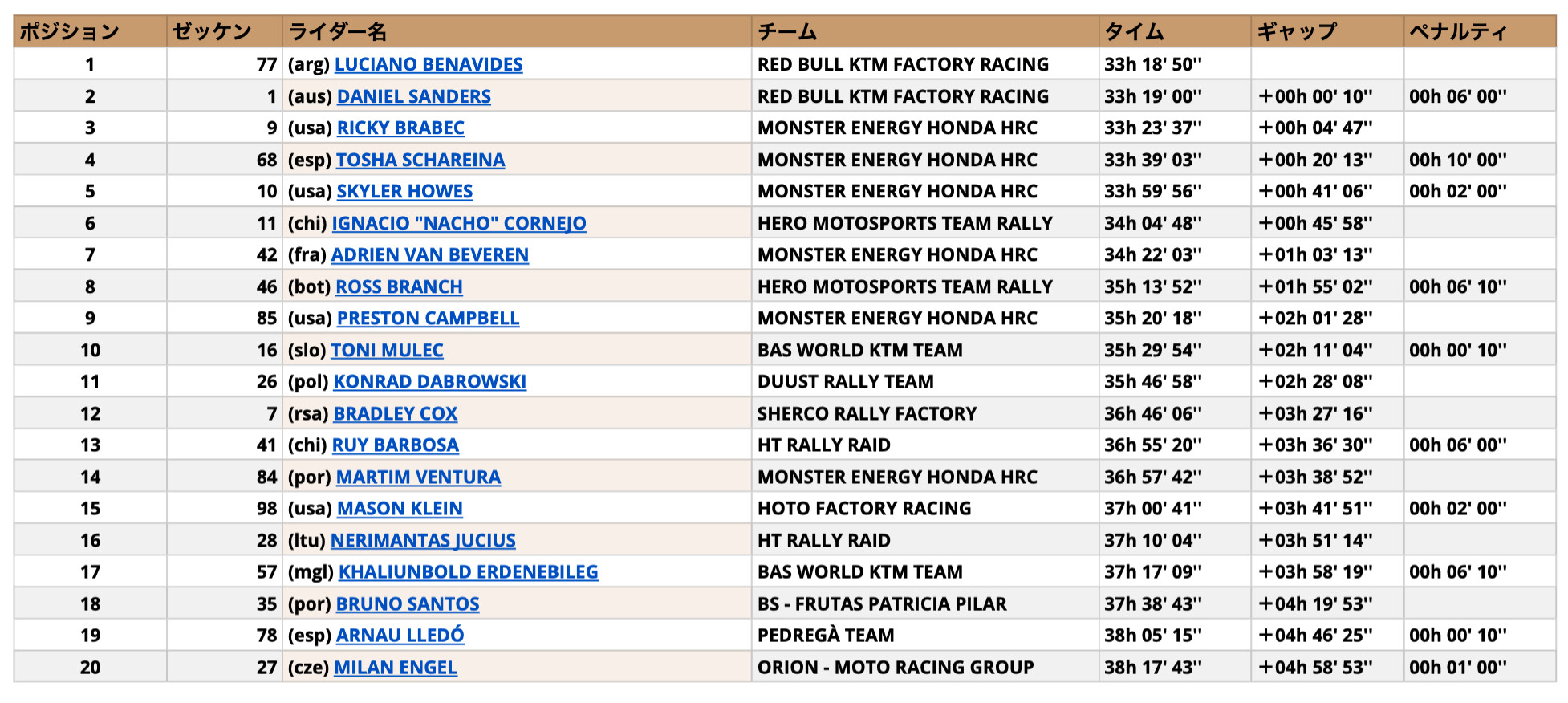 とはいえ、サンダースとの差は極めて僅かで、依然としてヤンブ到達への道は混沌としている。さらに、モンスターエナジー・ホンダHRCのリッキー・ブラベックがトップと4分47秒差で総合3位に浮上。20分遅れではあるが、シャレイナも4位につけており、タイトル争いから脱落したとは言い切れない状況だ。