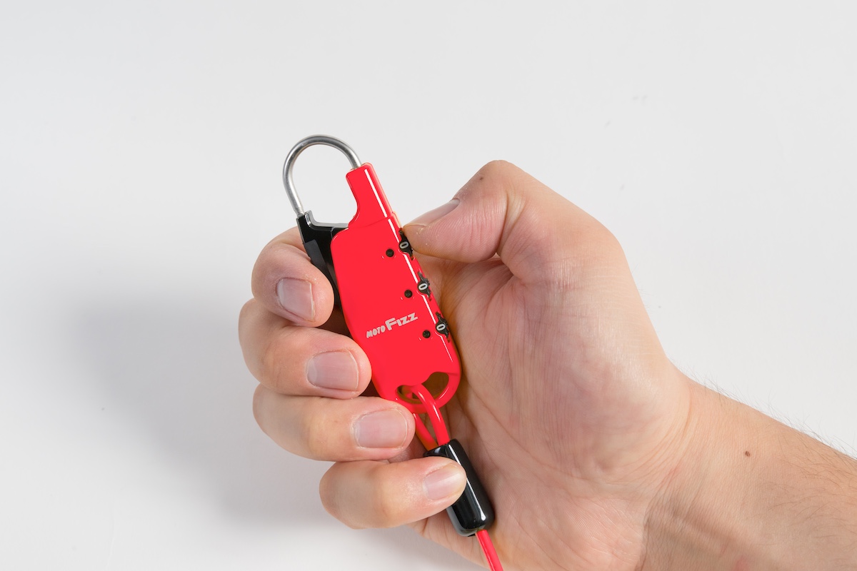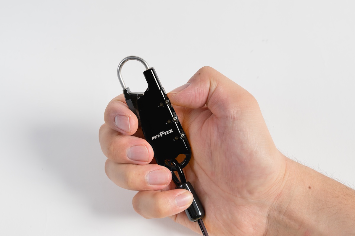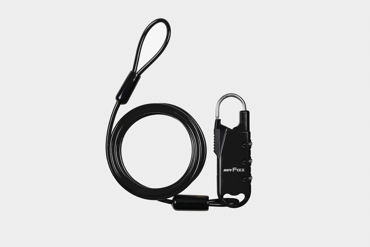 シートバッグなど車載バッグを安心して使用するために開発された本製品は、グラブバーやフレームに通しやすいストレートワイヤー形状を採用。110gの軽量設計で、扱いやすさと確実なロック機構を両立している。