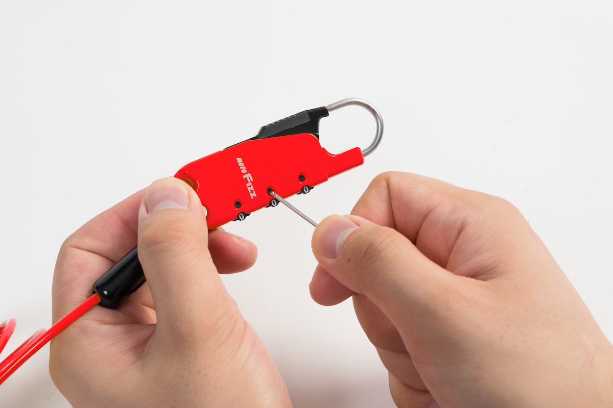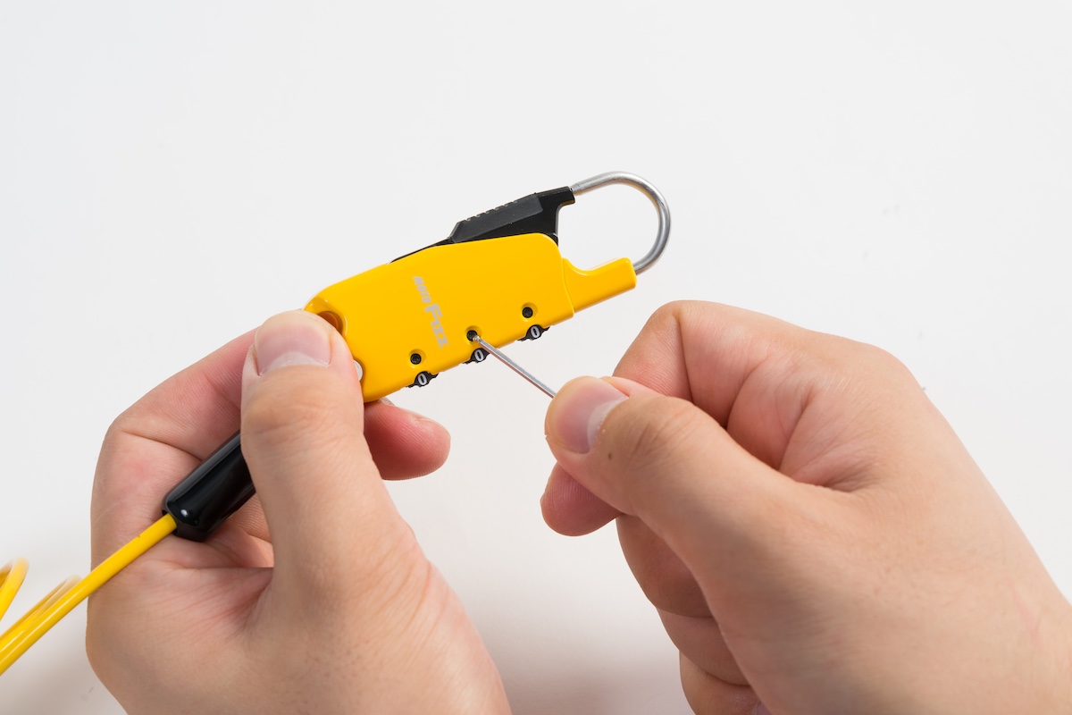 本体はダイヤル式ロックを採用し、鍵の持ち運び不要で使いやすい。ツル部(引っかけ部分)はファスナーのロック穴に通せる形状となっており、バッグ本体の開口部を直接施錠可能。さらにリセットボタンやリセットピンも付属し、暗証番号の再設定も可能。