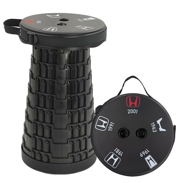 このスツールは、1963年から現在までのHonda歴代Hマークの変遷を一面にあしらったデザインが最大の特徴。天面に配されたロゴ群は、Hondaファンにとってまさに“歴史を座る”アイテムとも言える仕上がりだ。