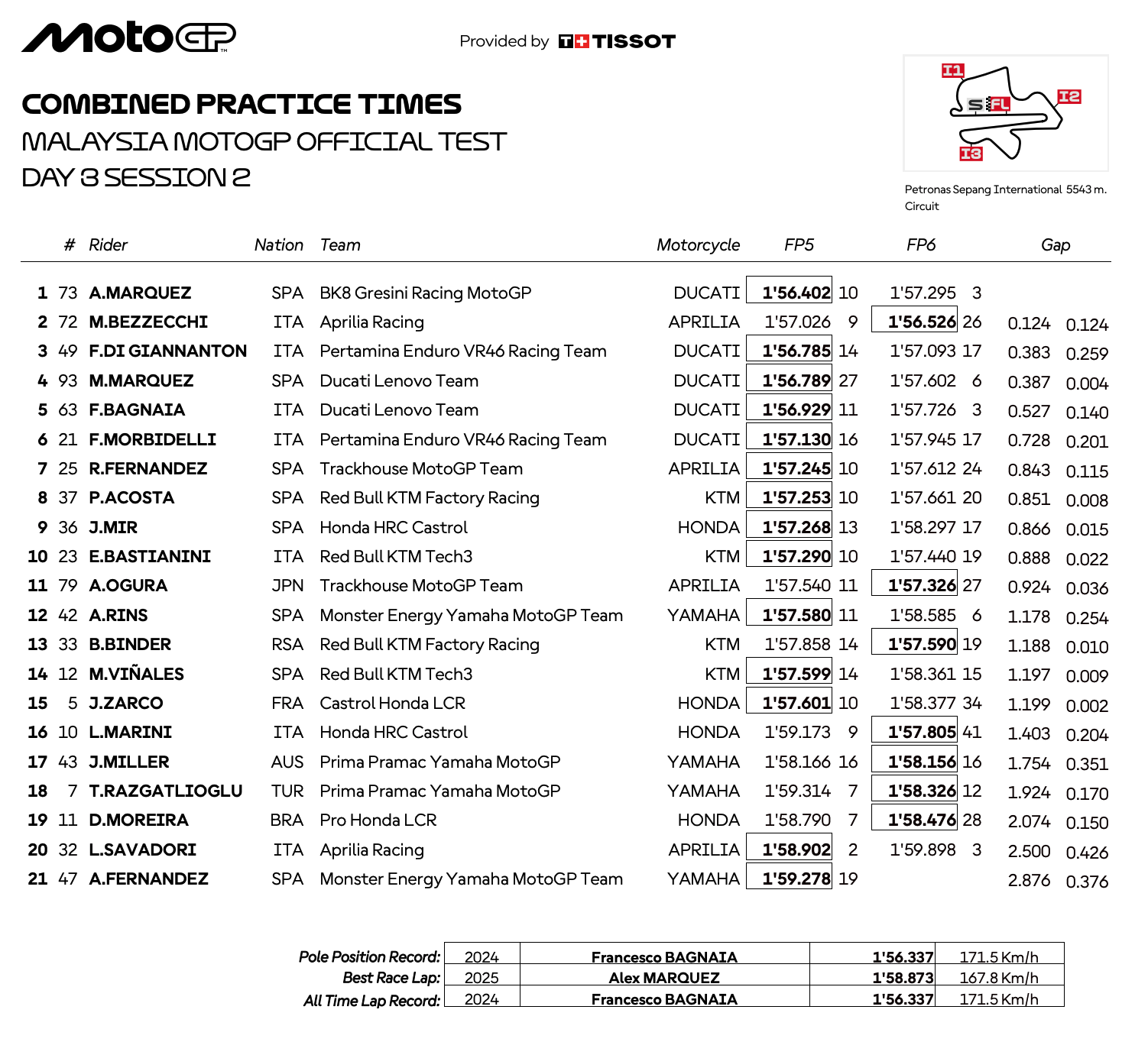 2026年シーズンに向けたプレシーズンテストがマレーシア・セパンで終了。最終日、BK8グレシーニ・レーシングのアレックス・マルケスが最速タイムを記録し、好調ぶりを見せつけた。2025年マレーシアGPの勝者でもある彼は、最後のスプリントシミュレーションでも平均1分58秒027を記録し、1分56秒402というベストラップで全体のトップを獲得。2番手にはアプリリア・レーシングのマルコ・ベッツェッキ、3番手にはVR46のファビオ・ディ・ジャンアントニオが続いた。