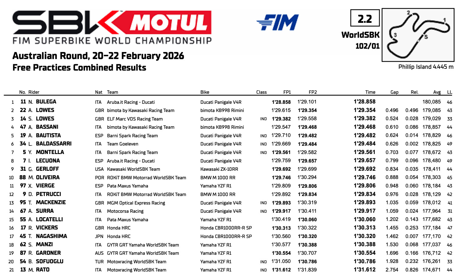 ニコロ・ブレガ(Aruba.it Racing – Ducati)が、MOTUL FIMスーパーバイク世界選手権オーストラリアラウンド初日を支配した。フィリップアイランド・グランプリ・サーキットで行われたFP1、FP2ともにトップタイムを記録。総合でも2番手アレックス・ロウズ(bimota by Kawasaki Racing Team)、3番手サム・ロウズ(ELF Marc VDS Racing Team)に0.5秒差をつけ、他を圧倒した。