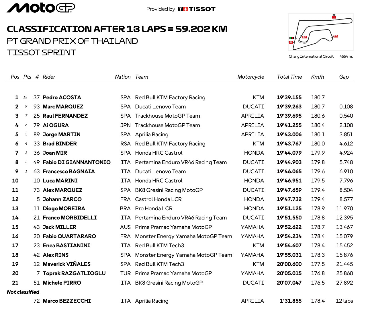 タイGPスプリントレースは13周で行われ、優勝したのはペドロ・アコスタだった。レースはマルク・マルケスがホールショットを奪ってレースをリード。その後マルコ・ベッツェッキがトップに立つも転倒リタイア。この展開でマルク・マルケスとアコスタの一騎打ちの展開となり、最後まで両者の攻防は続いた。