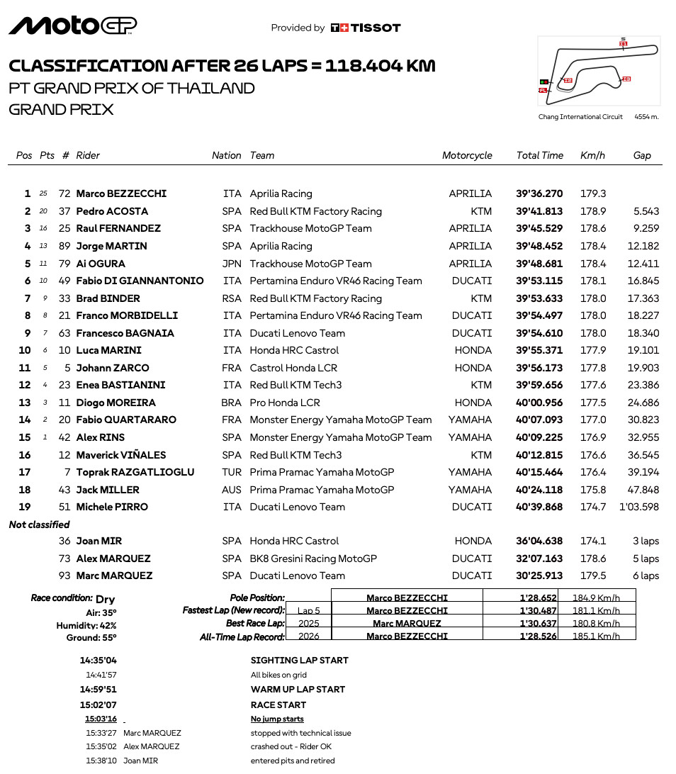 2026年MotoGP開幕戦PTグランプリ・オブ・タイランド決勝は波乱の展開となり、アプリリア・レーシングのマルコ・ベッツェッキが圧倒的な走りで優勝を飾った。2025年ポルトガル、バレンシアに続く3連勝を達成し、アプリリアにとってMotoGP史上初のハットトリックを成し遂げた。Tissotスプリント勝者のペドロ・アコスタ(レッドブルKTMファクトリー・レーシング)は2位でフィニッシュ。これによりタイを終えて世界選手権ランキング首位に立った。3位にはトラックハウスMotoGPチームのラウル・フェルナンデスが入り、開幕戦でダブル表彰台を獲得した。