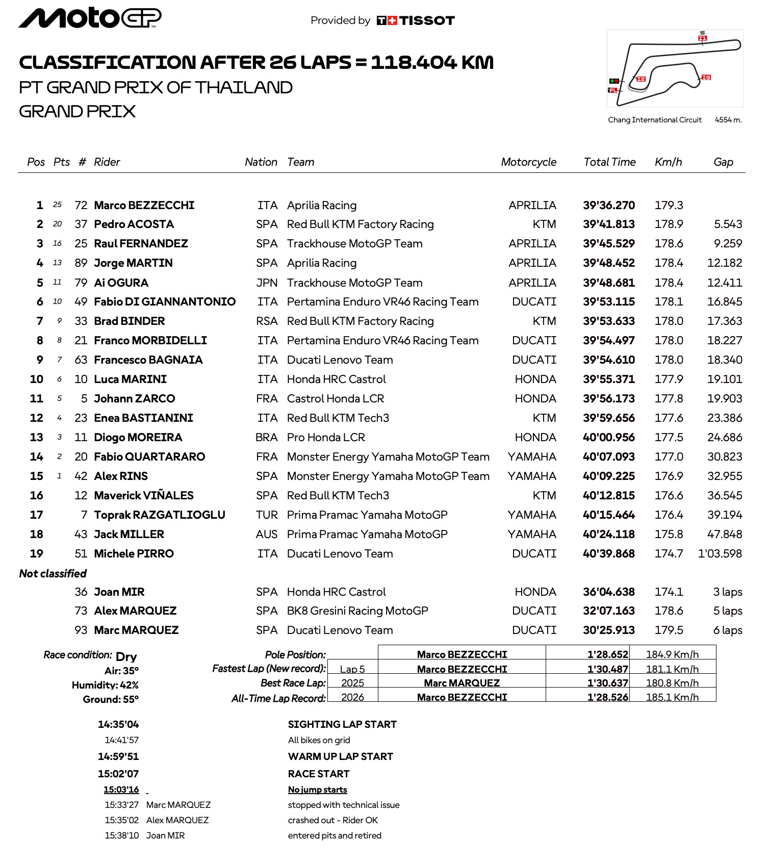 2026年MotoGP開幕戦PTグランプリ・オブ・タイランド決勝は波乱の展開となり、アプリリア・レーシングのマルコ・ベッツェッキが圧倒的な走りで優勝を飾った。2025年ポルトガル、バレンシアに続く3連勝を達成し、アプリリアにとってMotoGP史上初のハットトリックを成し遂げた。Tissotスプリント勝者のペドロ・アコスタ(レッドブルKTMファクトリー・レーシング)は2位でフィニッシュ。これによりタイを終えて世界選手権ランキング首位に立った。3位にはトラックハウスMotoGPチームのラウル・フェルナンデスが入り、開幕戦でダブル表彰台を獲得した。