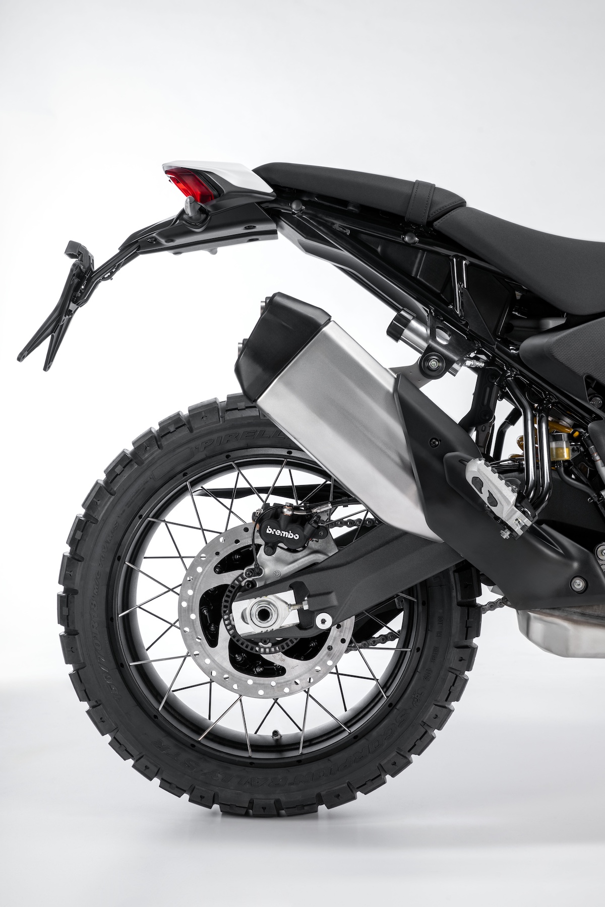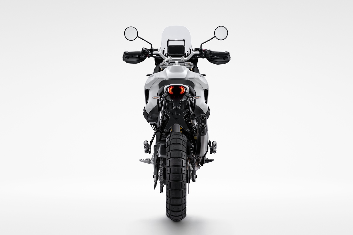 リアはミニマルでテクニカルなデザインとし、補助燃料タンク、パッセンジャーグラブレール、パニアフレームなどのアクセサリー装着に対応。プログレッシブリンク式リアサスペンションなど、主要メカニズムをあえて見せる設計となっている。