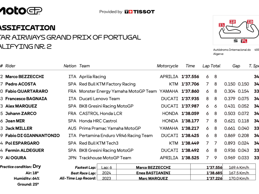 続きを読むベッツェッキ、アコスタとクアルタラロを抑えポルティマオでポール奪取 ポルティマオで行われたMotoGP公式予選Q2で、マルコ・ベッツェッキ(アプリリア・レーシング)が1分37秒556という驚異的なタイ