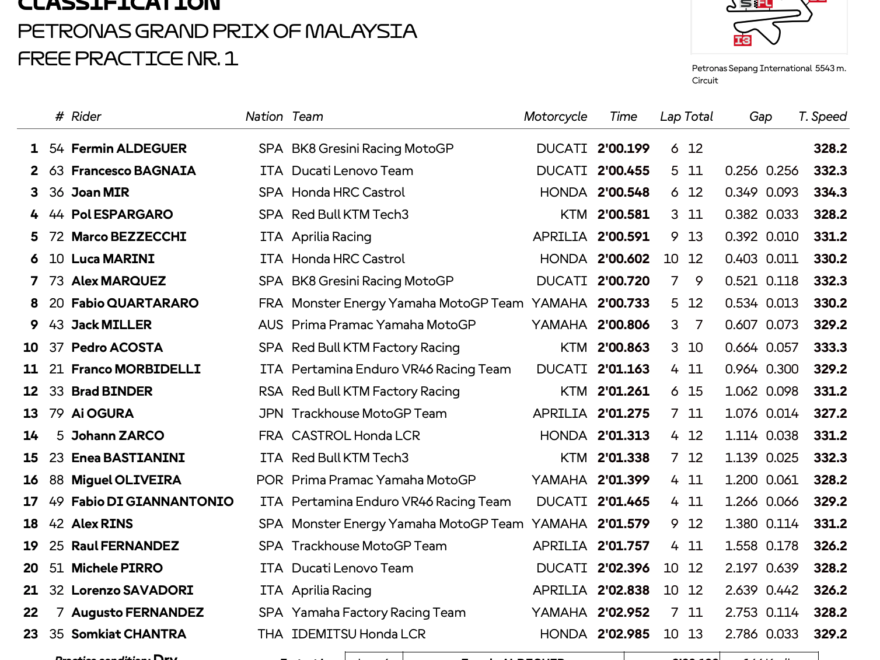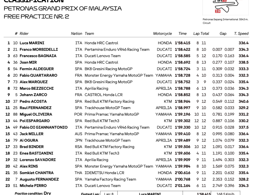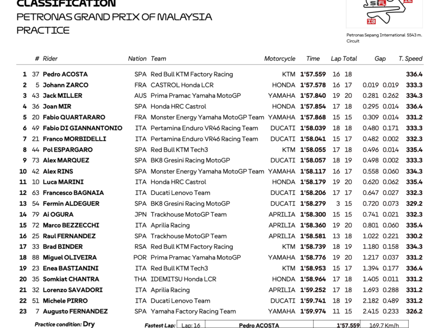 続きを読むマレーシアGPでペドロ・アコスタ(レッドブルKTMファクトリー・レーシング)が金曜プラクティスで1分57秒559を記録し、ジョアン・ザルコ(CASTROL Honda LCR)に0.019秒差をつけて