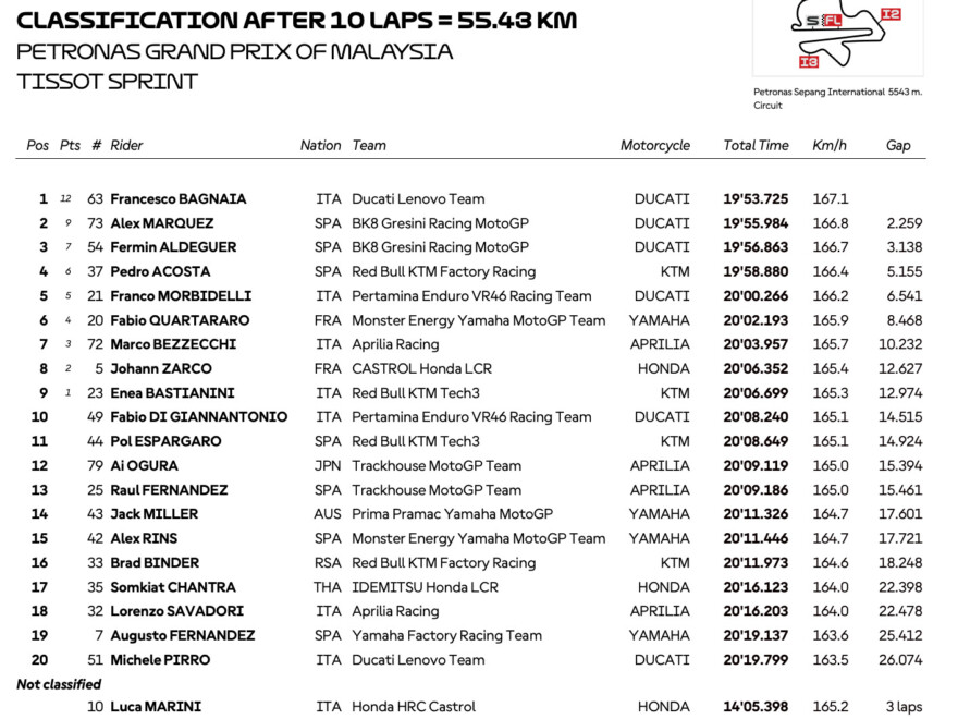 続きを読むマレーシアGPスプリントは、ポールのフランチェスコ・バニャイア(Ducati Lenovo Team)がホールショット。アレックス・マルケス(BK8 Gresini Racing MotoGP)、ペド